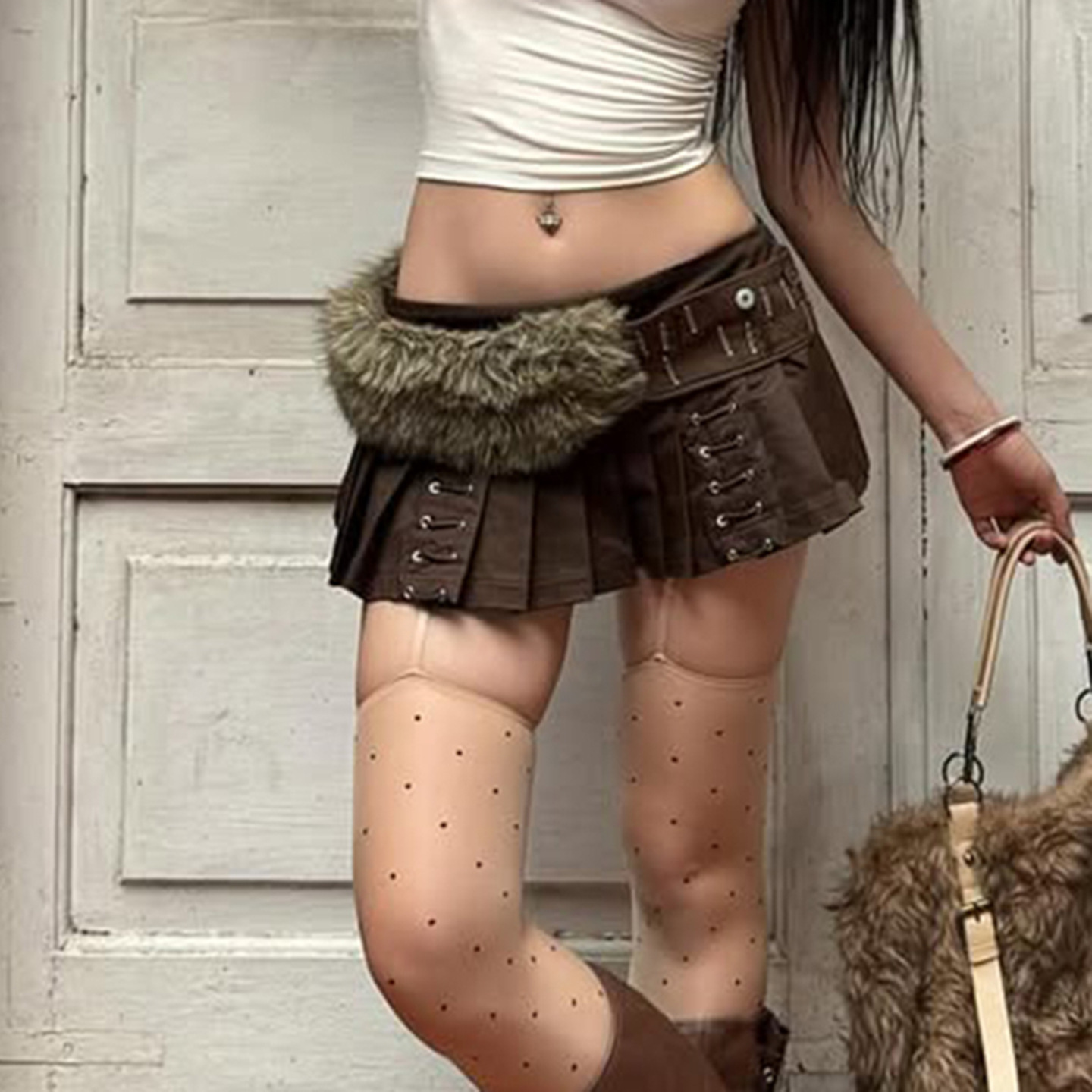 南斯拉夫风毛绒半身裙Y2K千禧辣妹风百褶裙毛毛拼接牛仔风超短裙