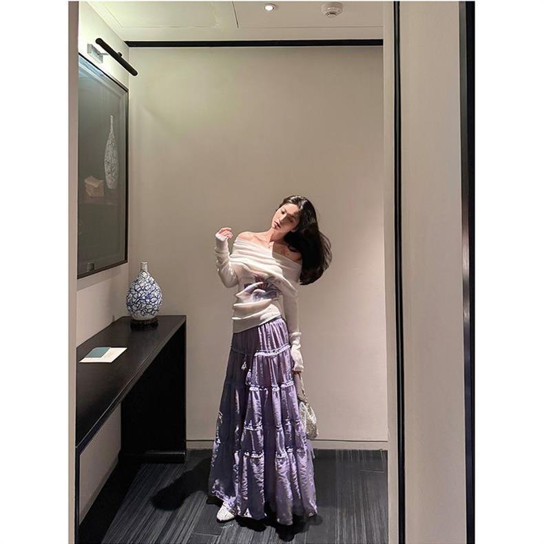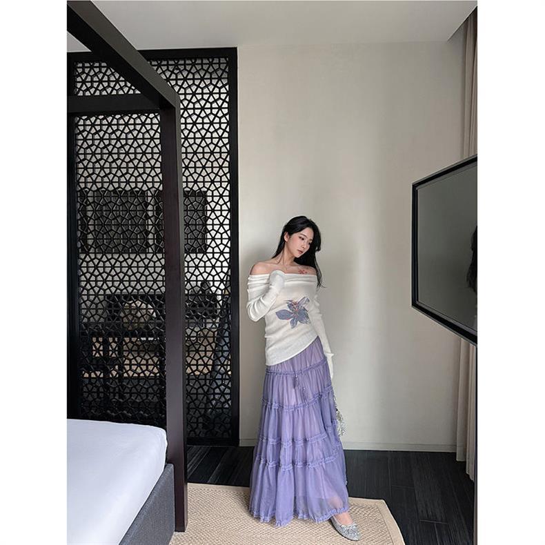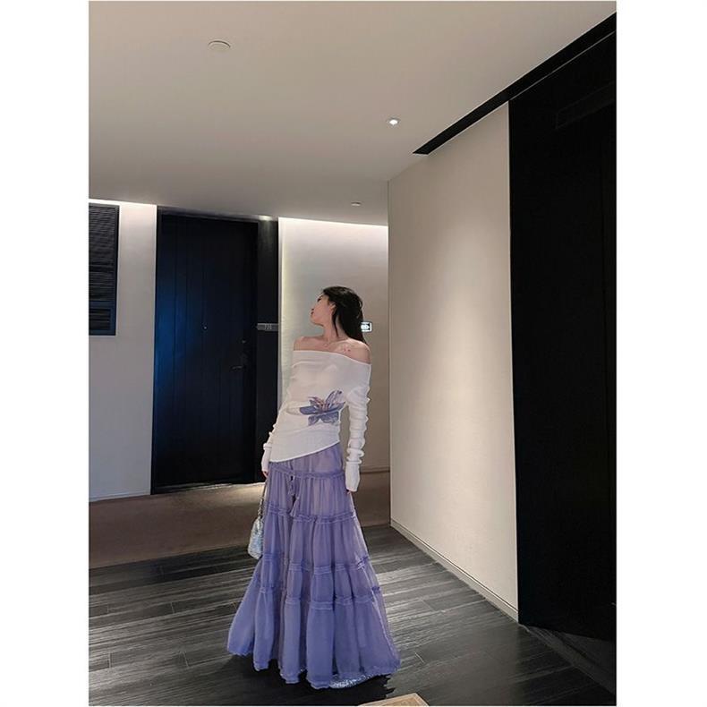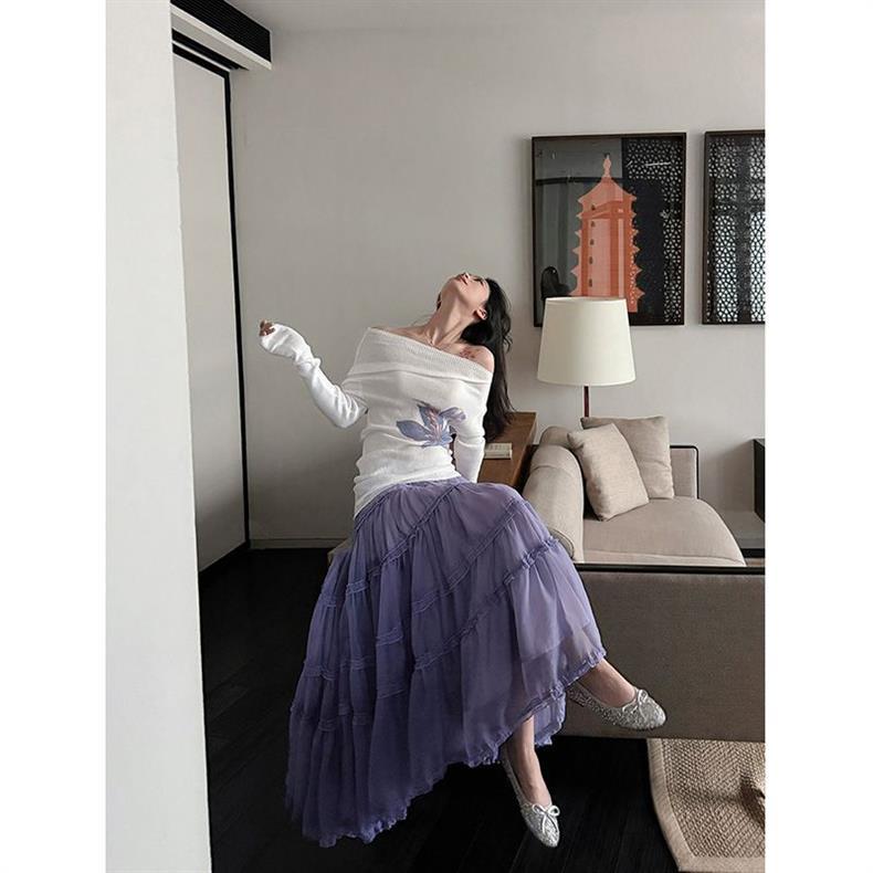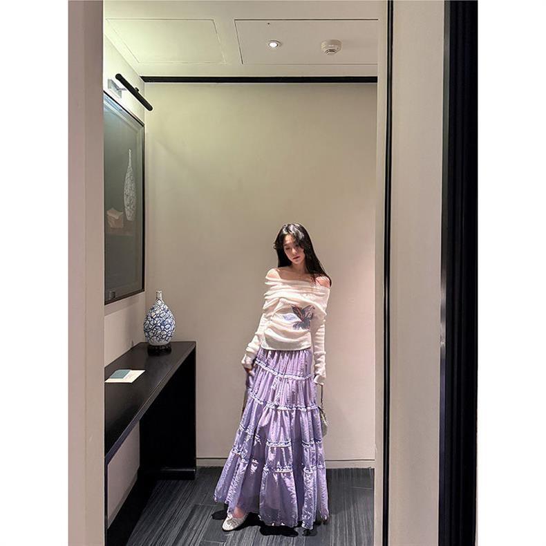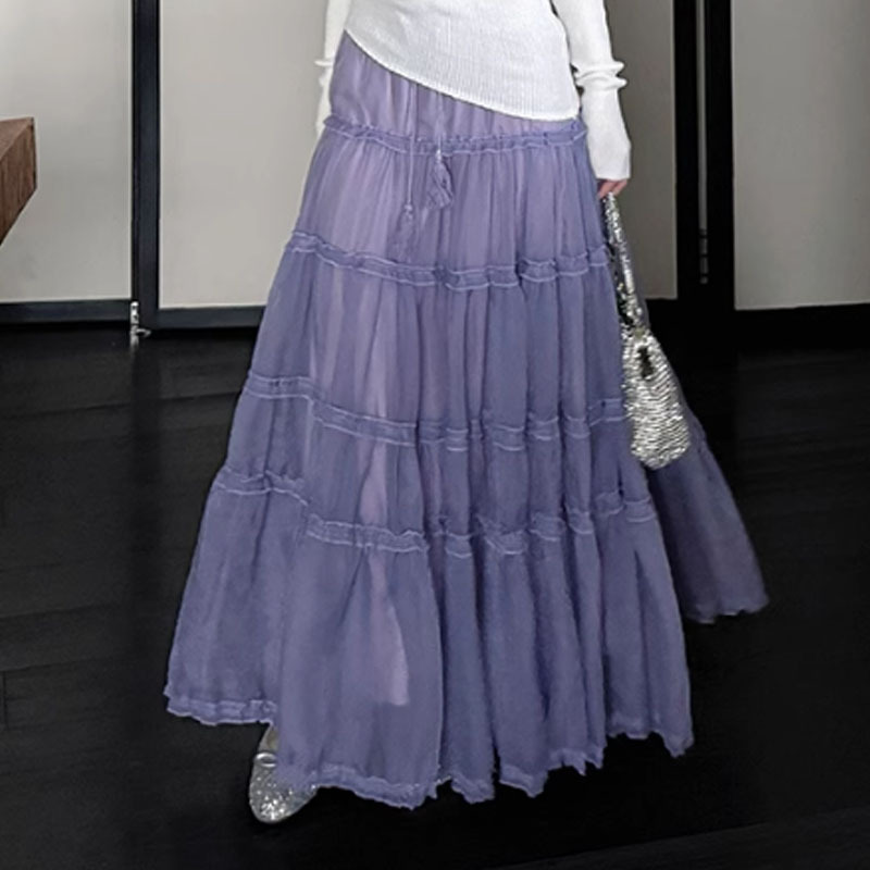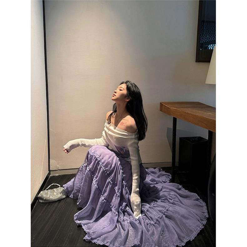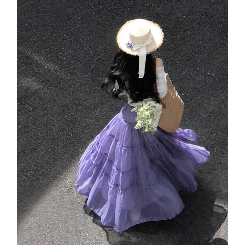 在庫ありパープルロングスカート女性のための 2025 新作春夏ケーキスカートフリル大裾スカート傘スカート