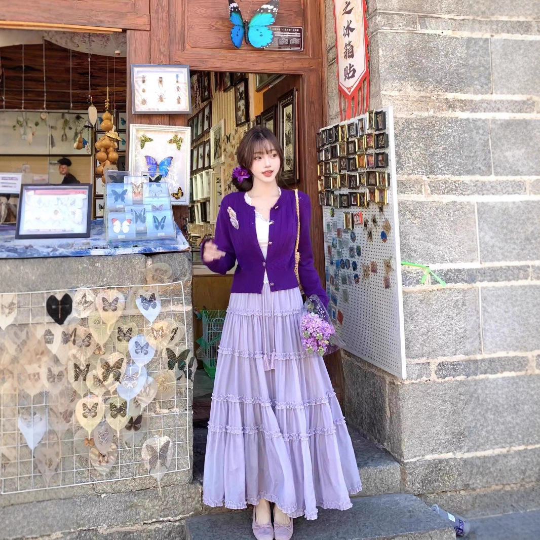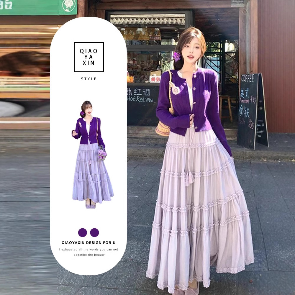 小香风套装女2025多巴胺紫色针织开衫上衣荷叶边蛋糕半身裙三件套