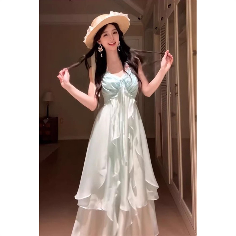 夏の雰囲気のリゾートスタイルミントマンボドーパミンウェアサスペンダーロングスカート女性の純粋な欲望スタイルのビーチドレス
