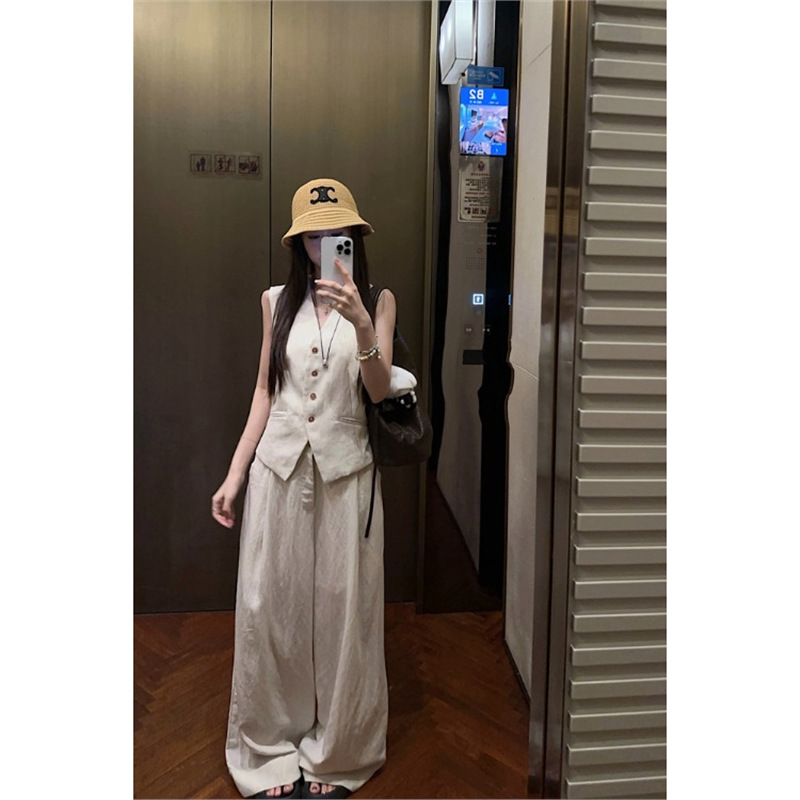 ファッションスーツシングルブレストベストベストトップ女性の夏のハイウエストカジュアルパンツワイドレッグパンツハイエンドツーピースセット