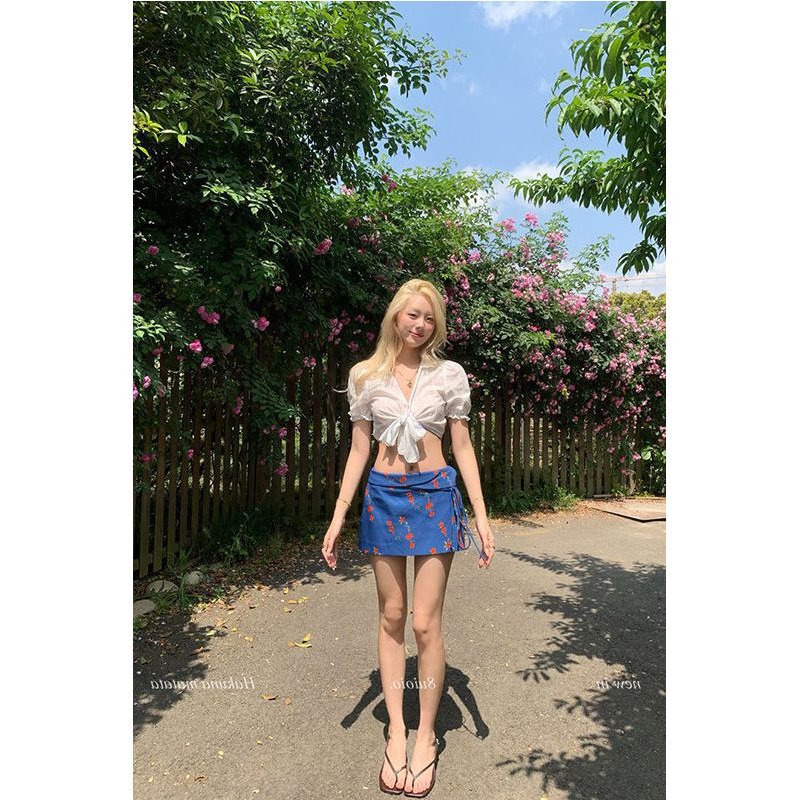 韓国の優しいスタイルのブルー花柄スカート女性の夏の新しいニッチ中空スリムフィットトップスーツ