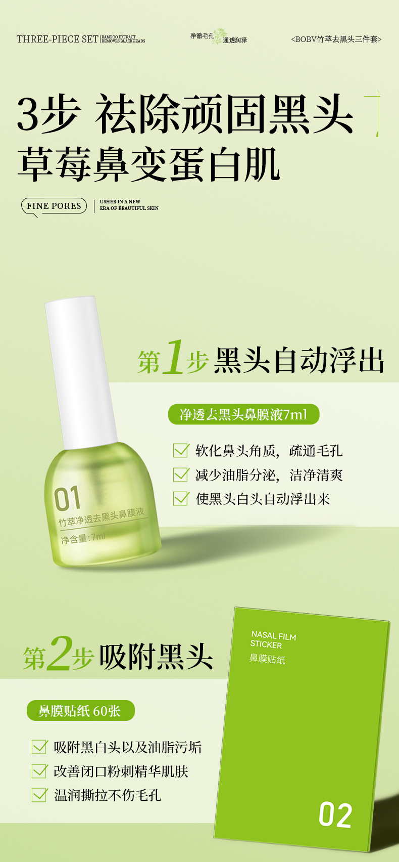 产品规格 BOBV竹萃去黑头三件套(鼻膜液7ml+精华液7ml+鼻膜贴纸60/片)