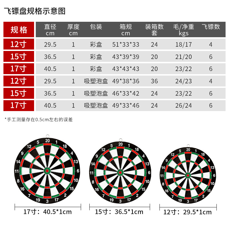 镖靶直径 12寸29.5CM*1CM泡壳包装,12寸29.5CM*1CM彩盒包装,15寸36.5CM*1CM泡壳包装,15寸36.5CM*1CM彩盒包装,17寸40.5CM*1CM泡壳包装,17寸40.5CM*1CM彩盒包装