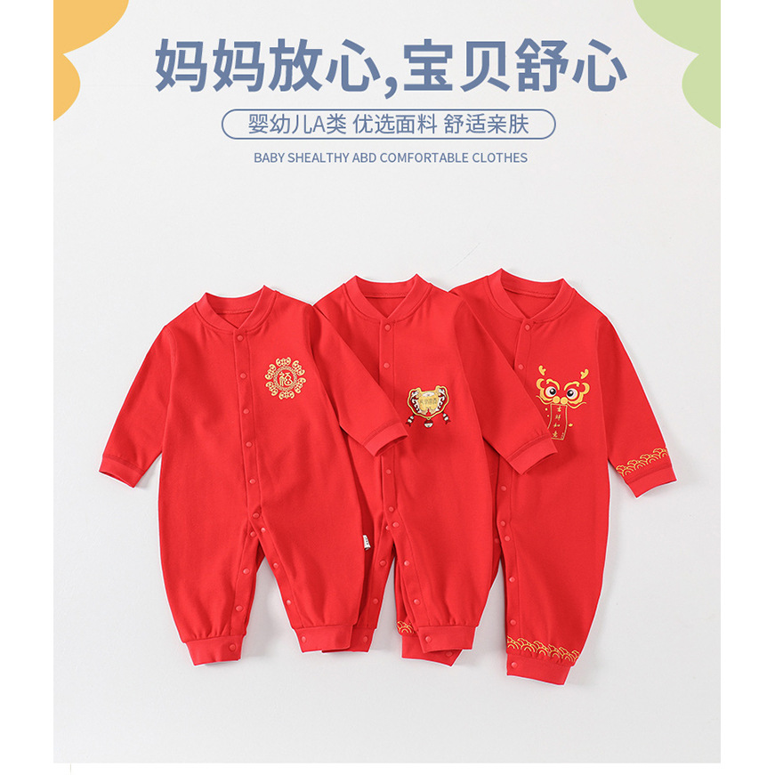 婴得宝婴儿连体衣a类纯棉加绒四季款大红宝宝哈衣满月喜庆衣服