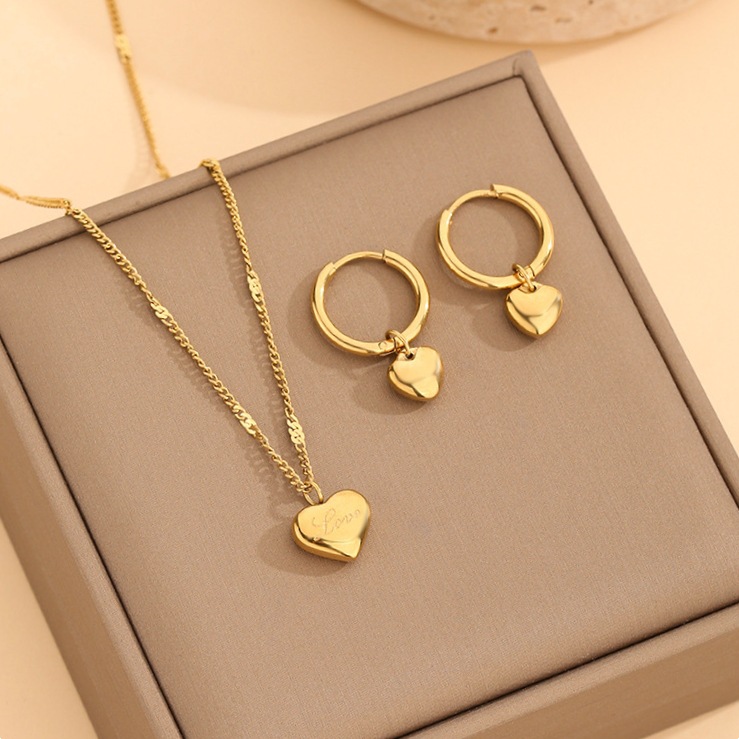 时尚简约激光雕刻love爱心钛钢项链18k金不褪色心形耳圈耳环项链