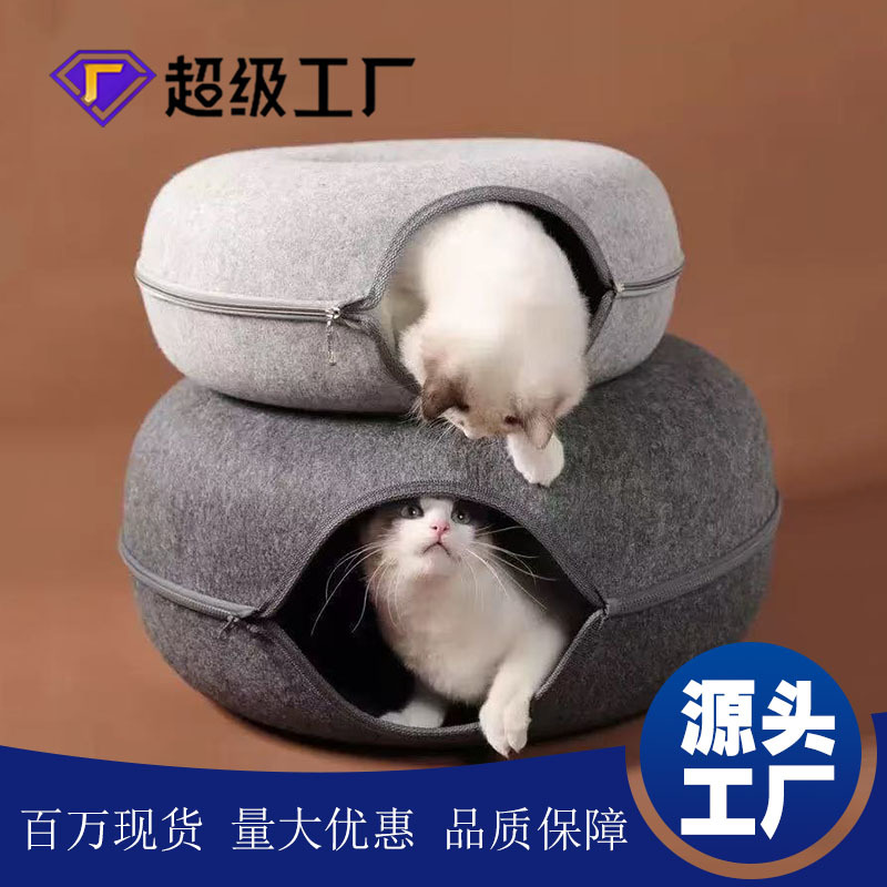 メーカー直送 フェルト製猫用ベッド フェルト製トンネル ドーナツ型半密閉型ジッパー付きペットベッド 耐摩耗性・耐引っかき性
