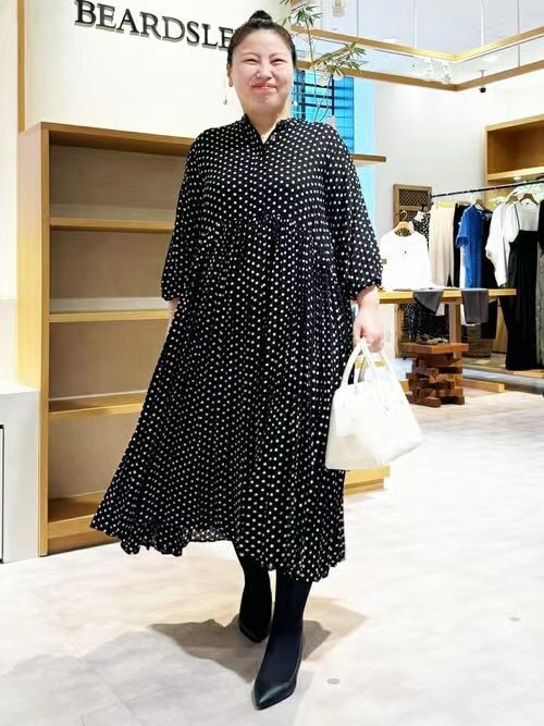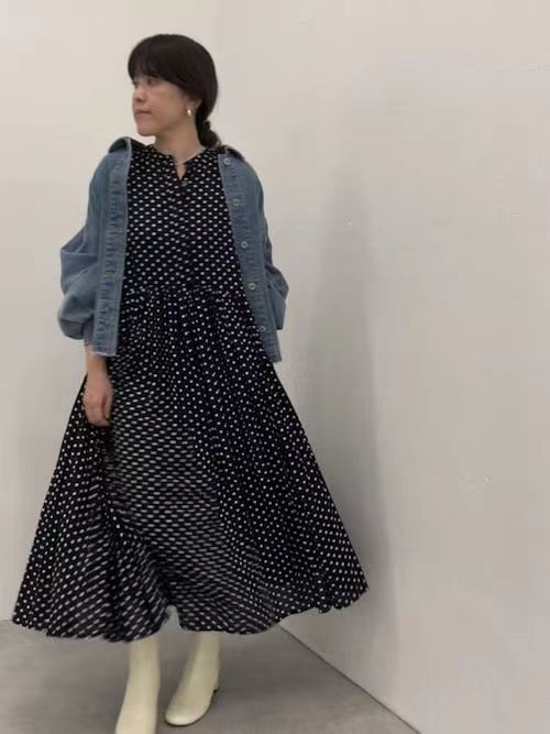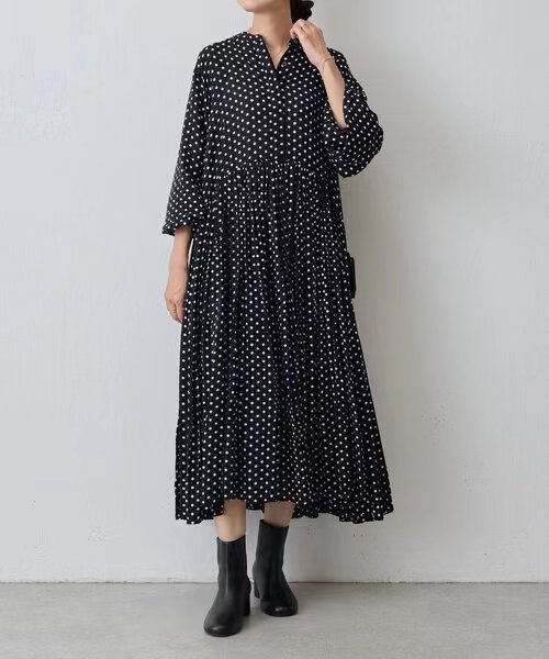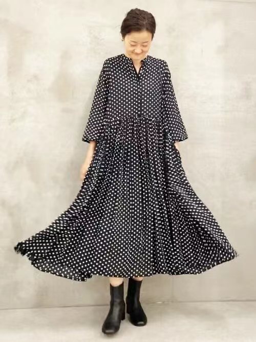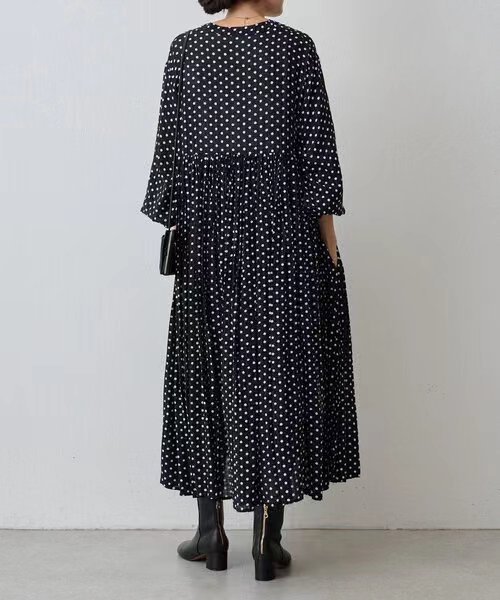 2024秋ロングラウンドネックプリーツ長袖水玉ドレス