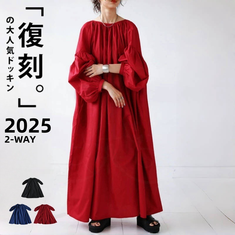 2025日系春の新型女装純色の両面にスカートの長袖の灯籠の袖を着てワンピースの3色を縛ります。