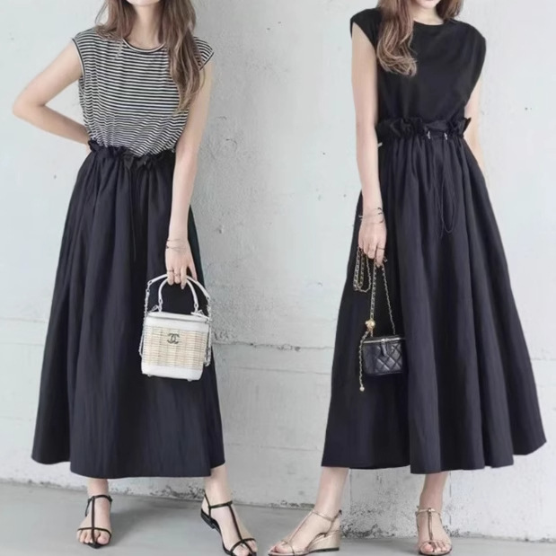 クロスボーダー貿易日本文学芸術スカートウエストを絞ってゆったりとした純綿ノースリーブコントラストカラーステッチフラワーバドドレス夏