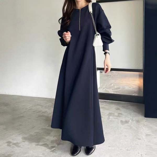 跨境日系乐天秋冬新款简约宽松高领毛衣拼接裙长袖气质连衣裙长裙