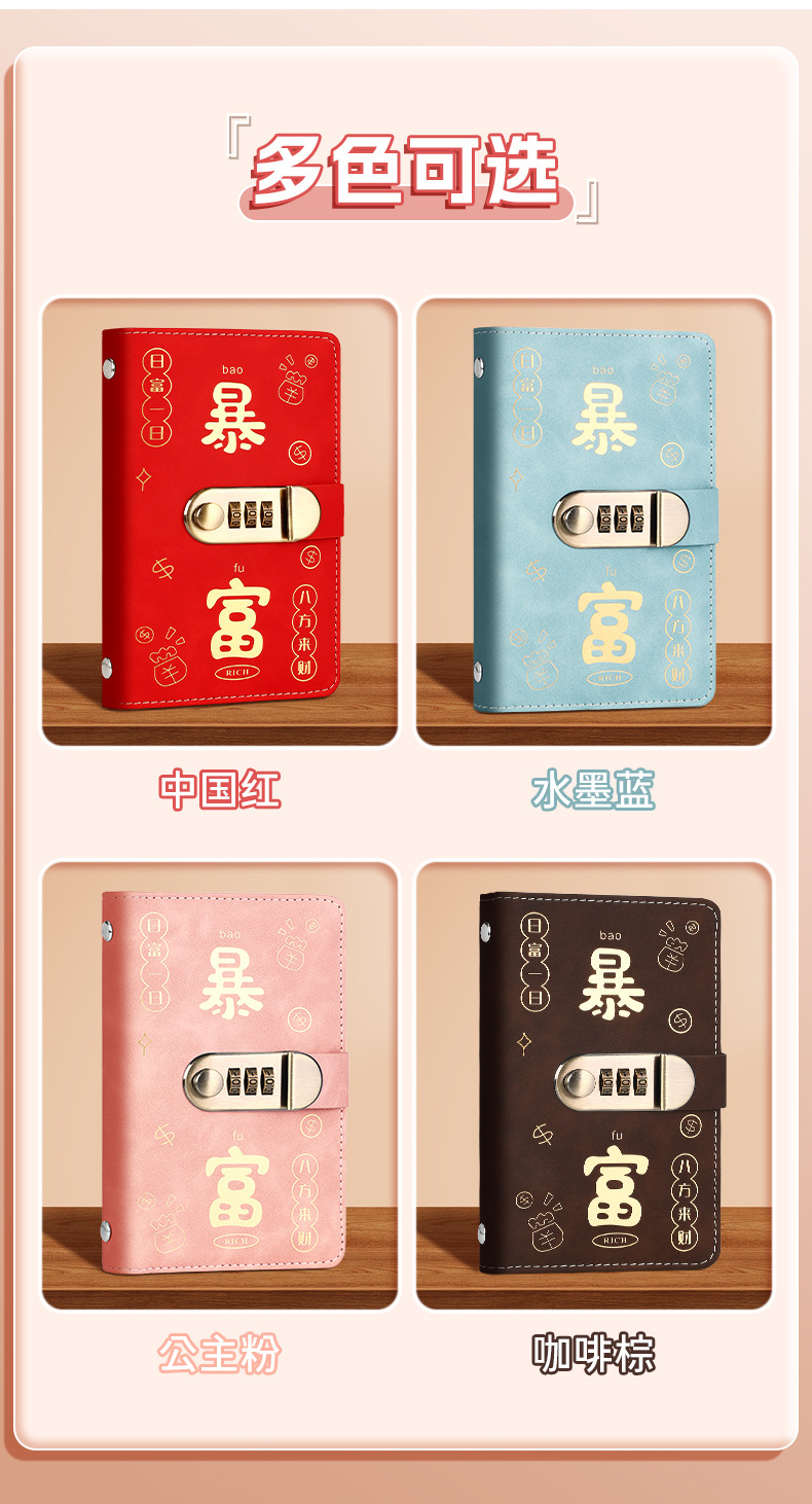 封面颜色 密码锁【暴富-中国红】升级款可存100张,密码锁【暴富-水墨蓝】升级款可存100张,密码锁【暴富-公主粉】升级款可存100张,密码锁【暴富-棕色】升级款可存100张,密码锁【暴富-黑色】升级款可存100张,财神爷暴富密码锁(中国红)升级款可存200张,财神爷暴富密码锁(棕色)升级款可存200张,财神爷暴富密码锁(水墨蓝)升级款可存200张,财神爷暴富磁扣款(中国红)升级款可存200张,磁吸扣【暴富-粉色】50张可存1w,磁吸扣【暴富-红色】50张可存1w,磁吸扣【暴富-蓝色】50张可存1w,磁吸扣【暴富-咖啡色】50张可存1w
