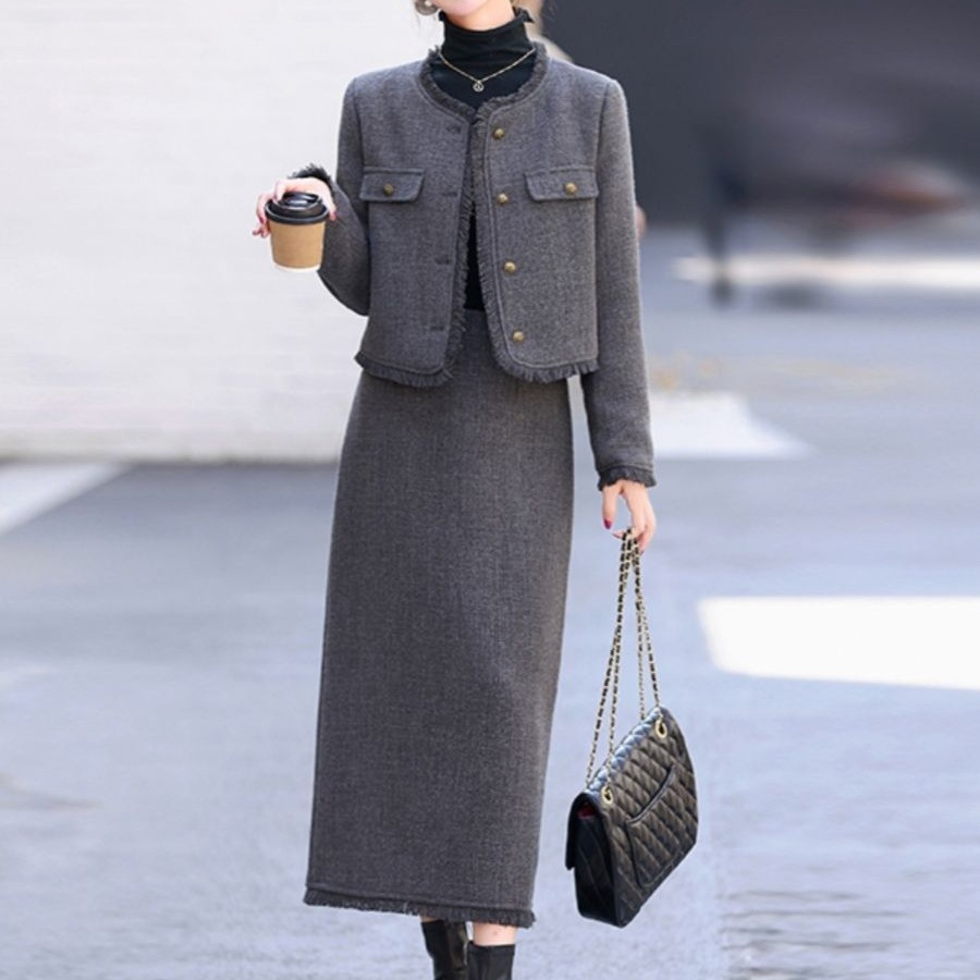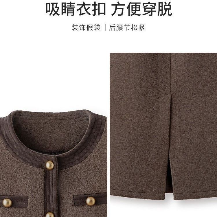加绒加厚小香风套装秋冬新款气质修身半身裙外套两件套