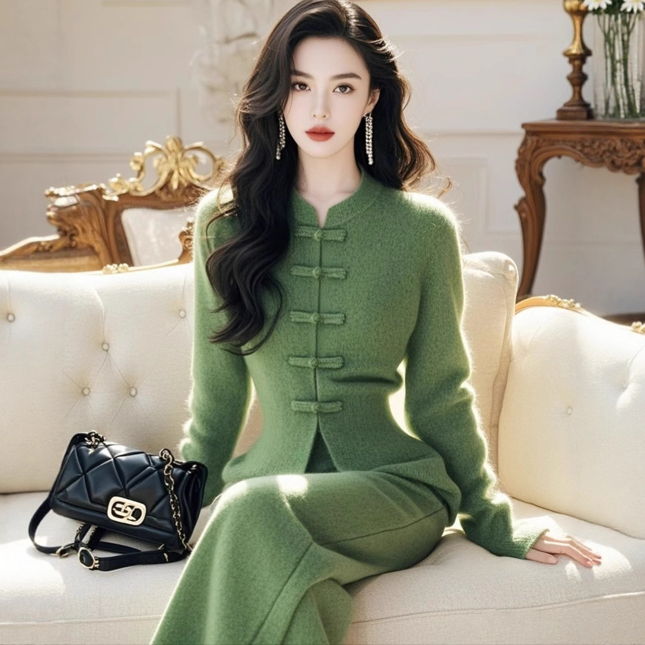 2025秋冬季穿搭一整套高级感小香风新中式国风盘扣毛衣裤子套装女
