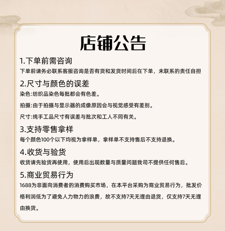 1688.comは中国で生産され、流通している商品を扱うBtoB卸サイトとなります。お客様が弊社サイト内にて仕入処理をされても、日本国内の法律に則り、日本への輸入ができない商材もあり、その場合弊社でも仕入れの手配が出来ません。その際はシステム上で、自動的に注文削除となってしまう事を、恐れ入りますがご了承願います。