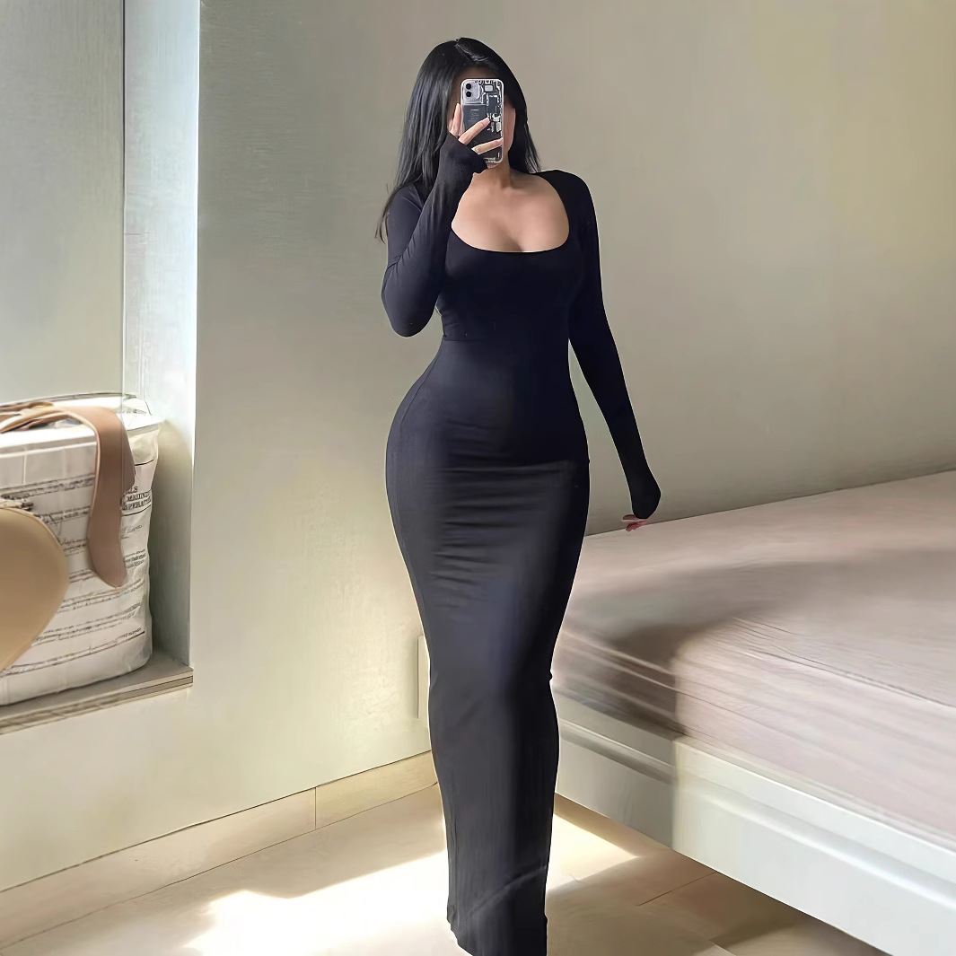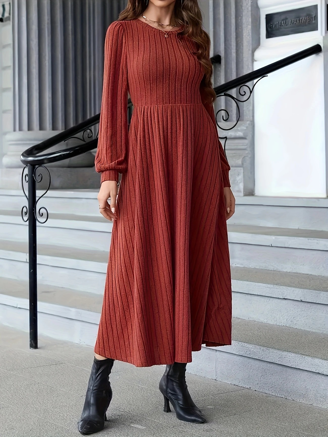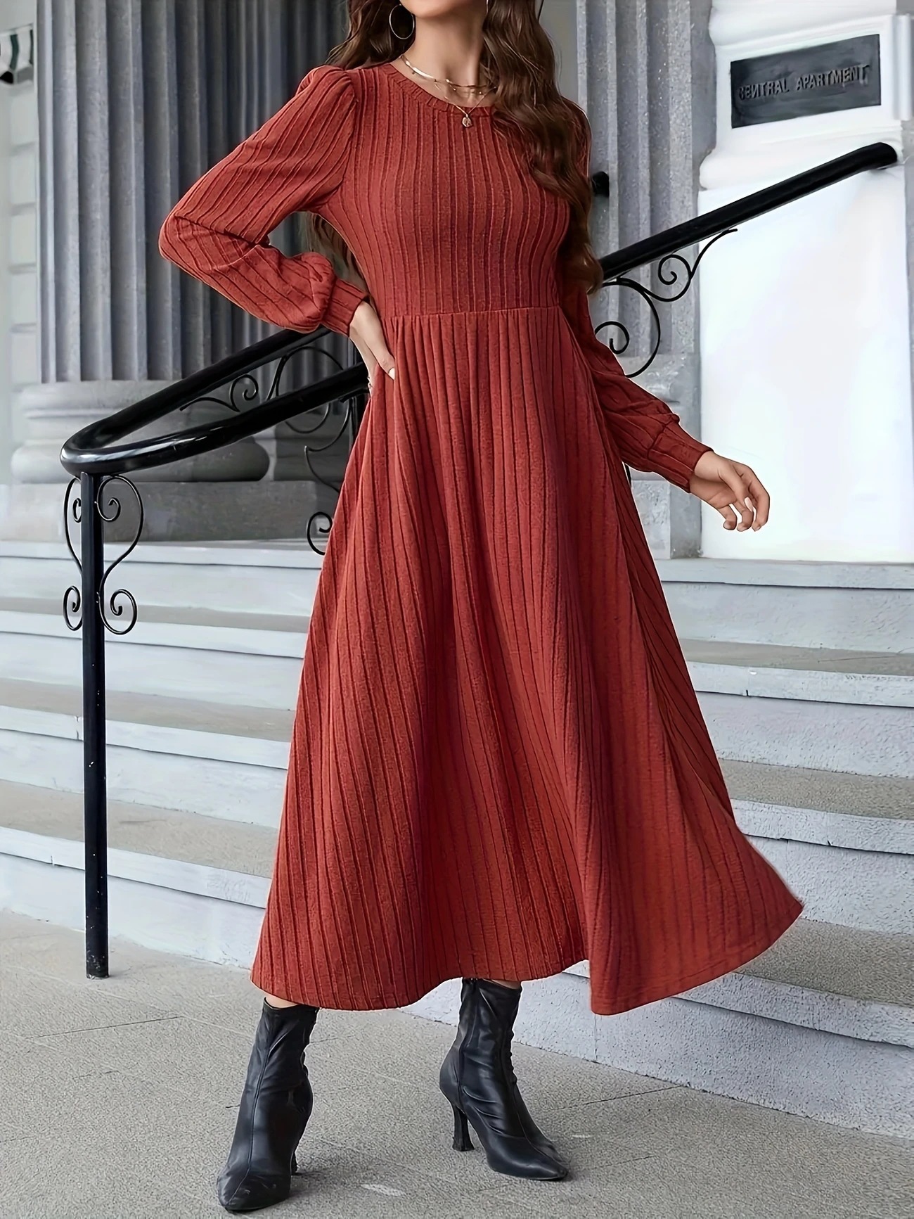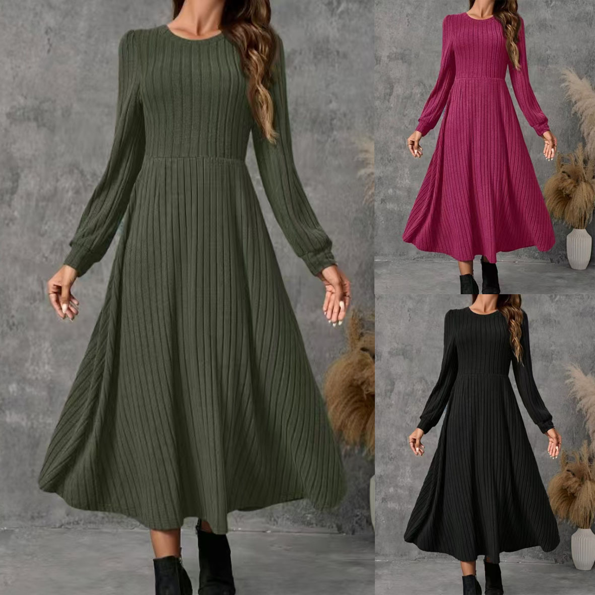 2025秋冬新款欧美亚马逊女装长裙跨境圆领纯色A摆针织长袖连衣裙