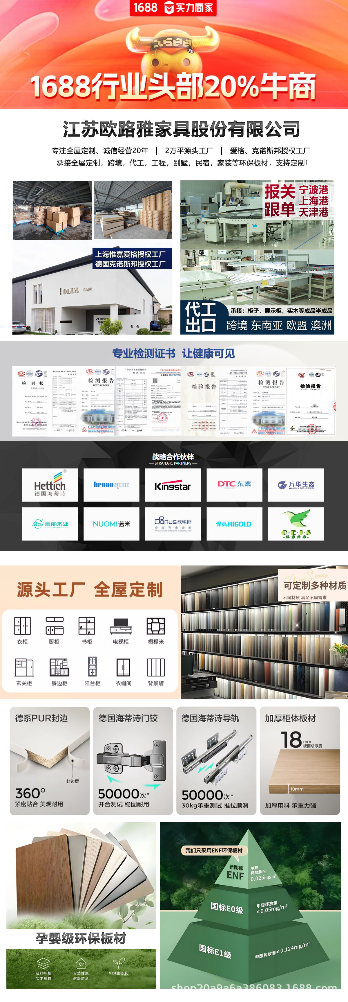 欧路雅全屋定制立足苏州,主打孕婴级环保板材|全铝蜂窝板,F4星/ENF级的实木,松木,橡木,颗粒板,欧松板等,目前合作及授权的品牌有:爱格/克诺斯邦/兔宝宝/露水河/华富立/鲁丽/万华/千年舟/千禧/奥维/华纳/悍高/海蒂诗/诺米/DTC等知名绿色环保品牌。