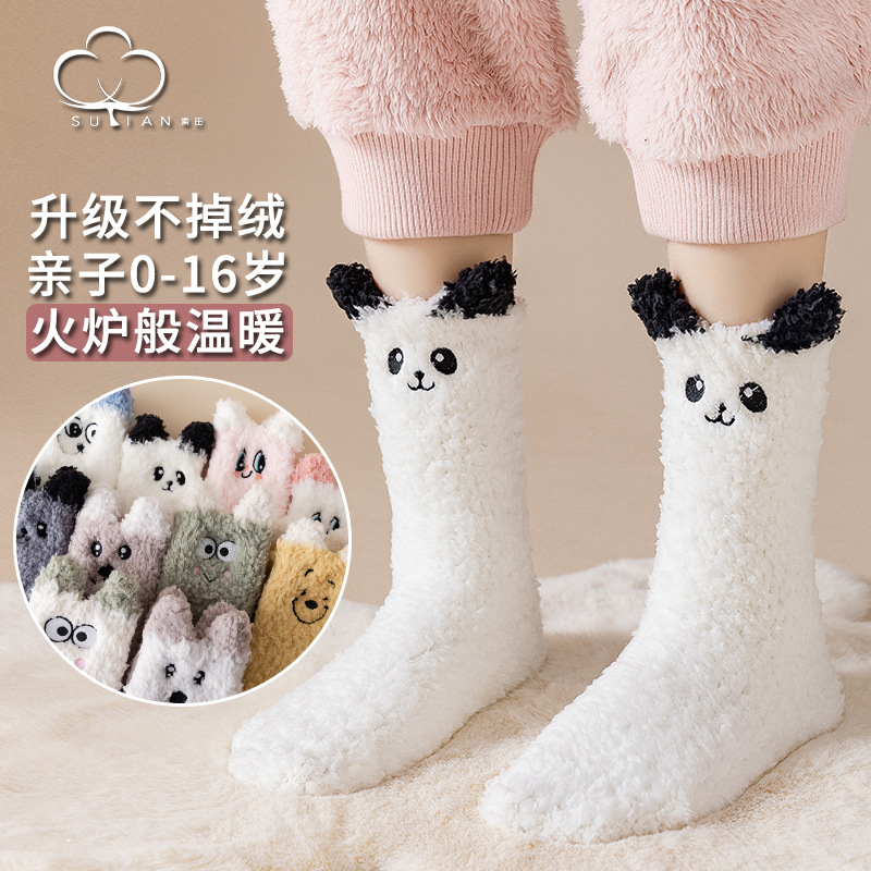 亲子款可爱珊瑚绒睡眠袜冬季加绒保暖中筒袜加厚防寒居家中筒女袜