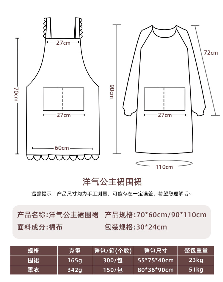 罩衣:单品尺寸(90*110cm)单品克重(342g)单品包装尺寸(30*24cm)大货包装(150件/包)大货尺寸(80*36*90)大货重量(51kg)