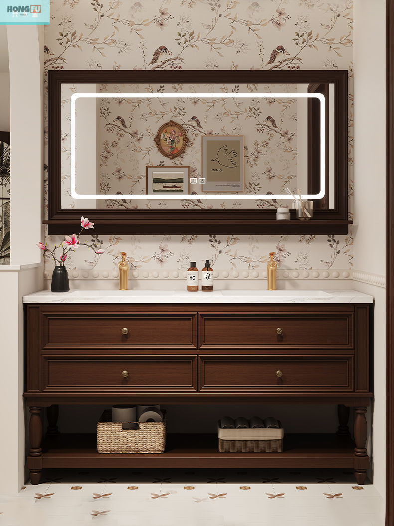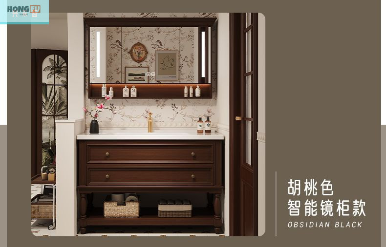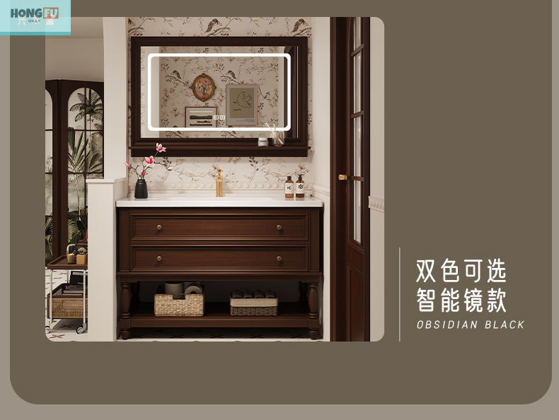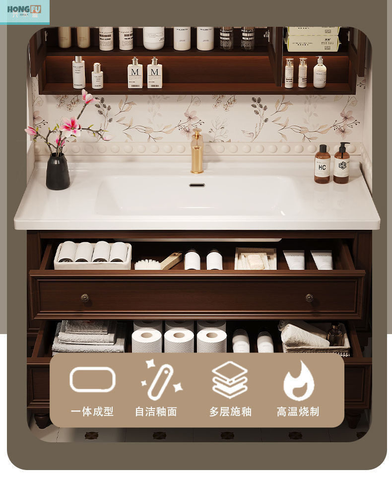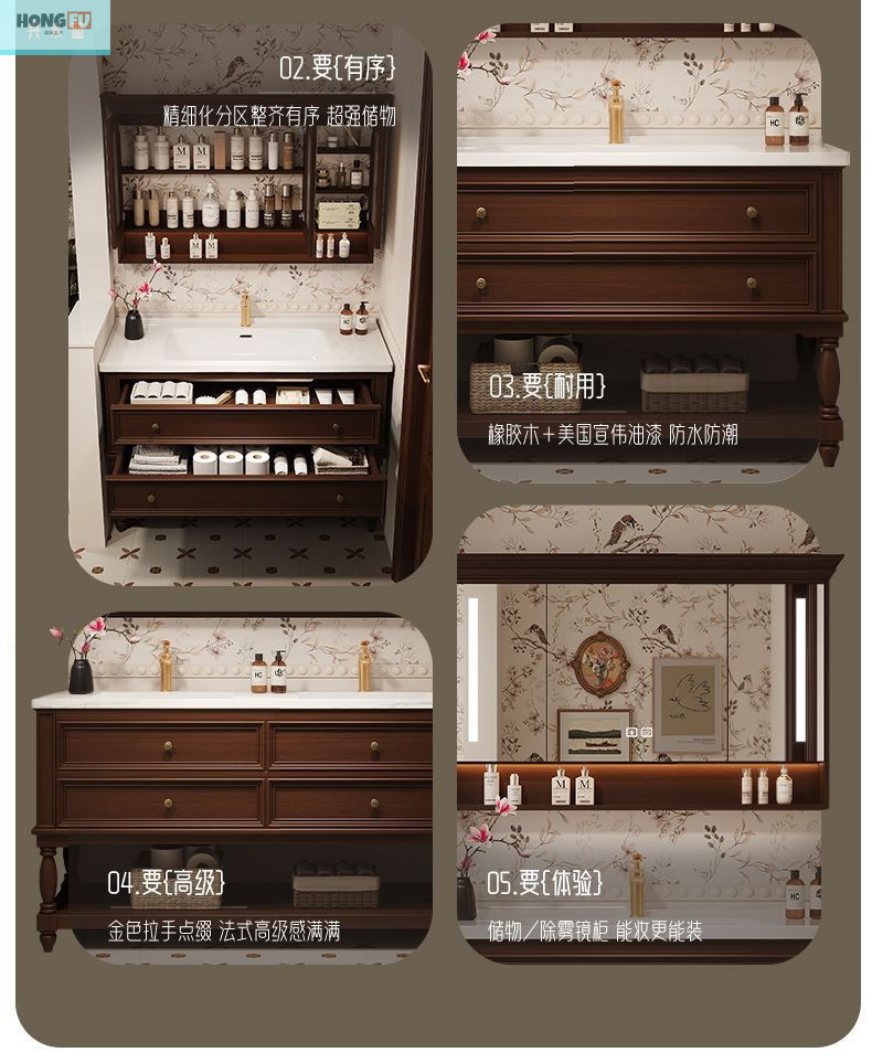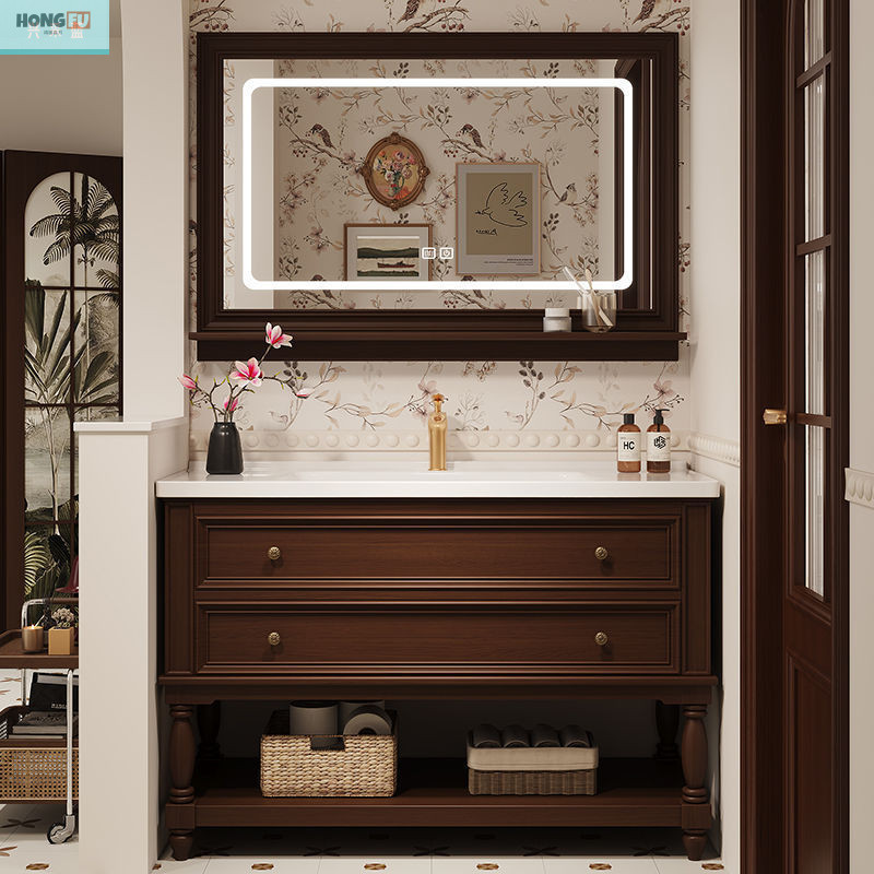 美式中古风浴室柜组合橡木实木法式卫生间洗漱台一体陶瓷盆卫浴柜