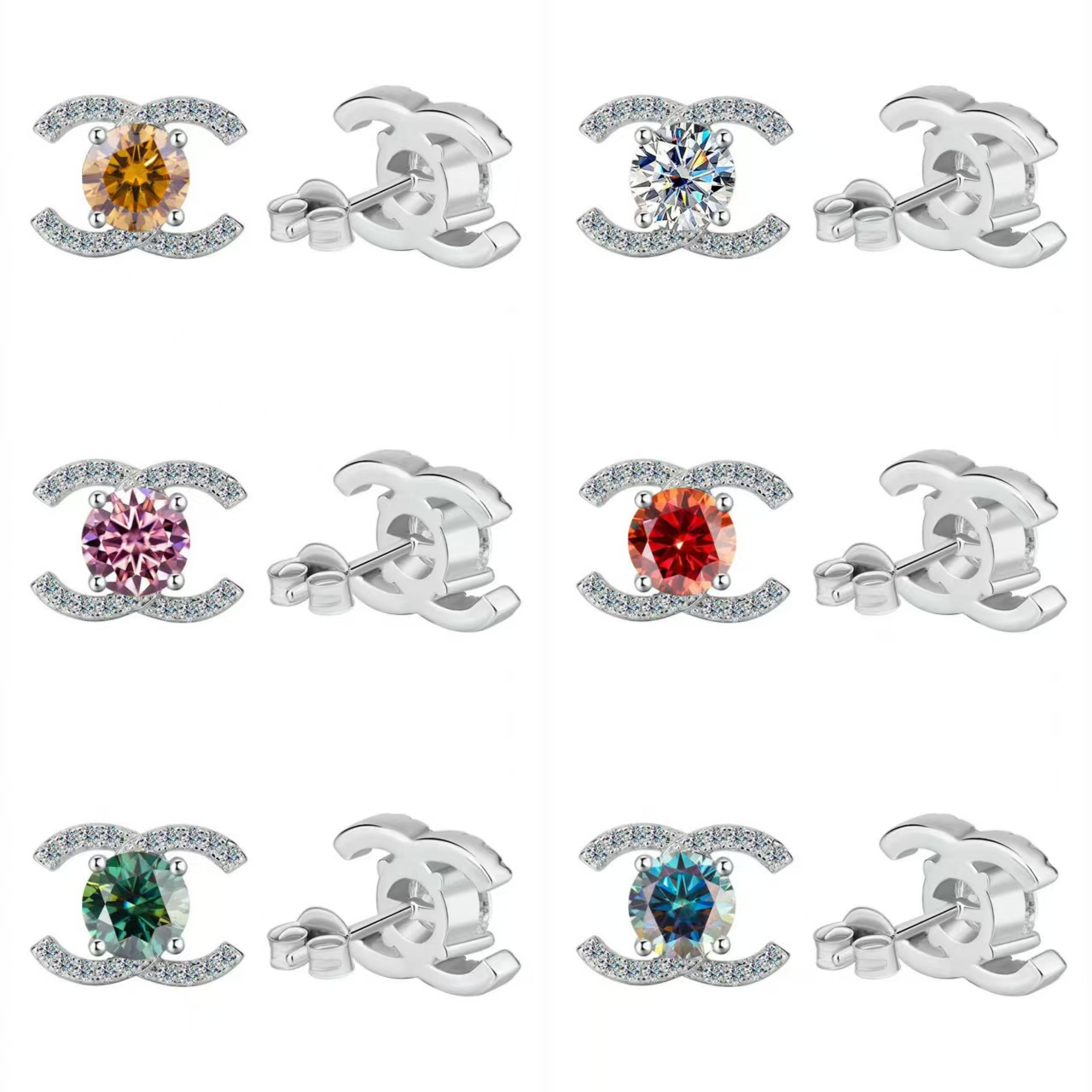 ダブルcジルコンピアス女性超フラッシュ白色モザイクジルコン睡眠無摘入ピアスアレルギー防止保色クロスボーダー銀飾り