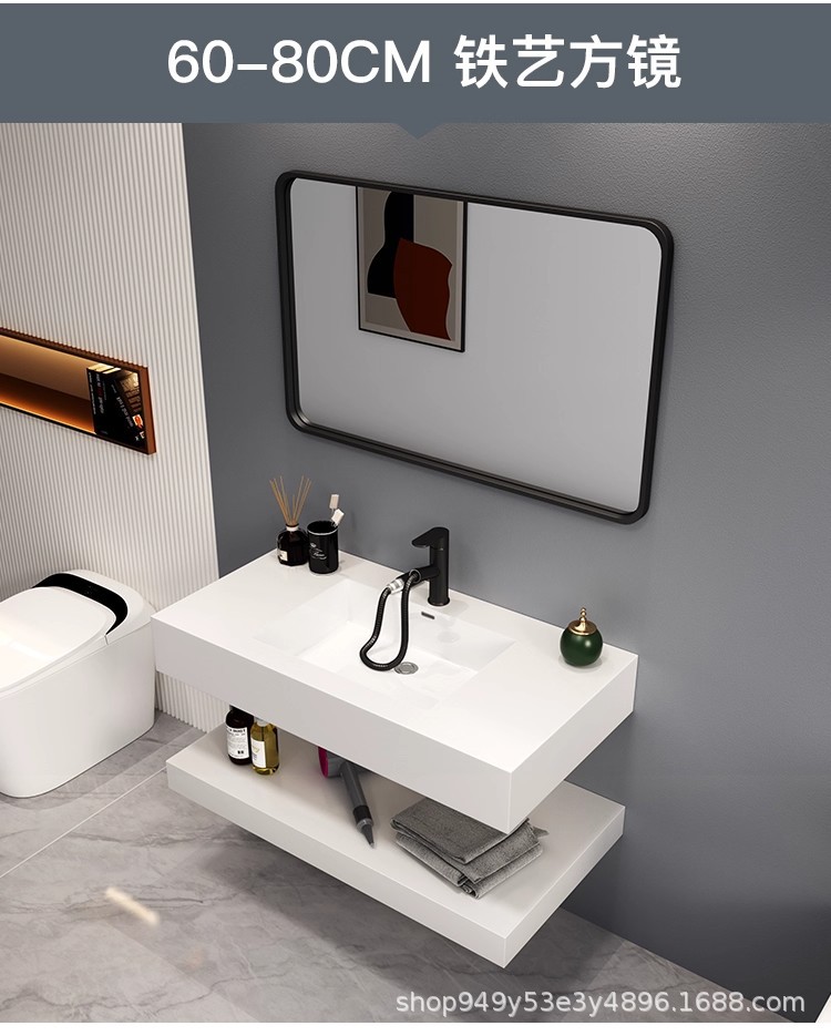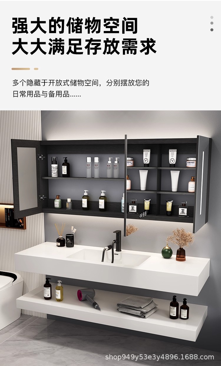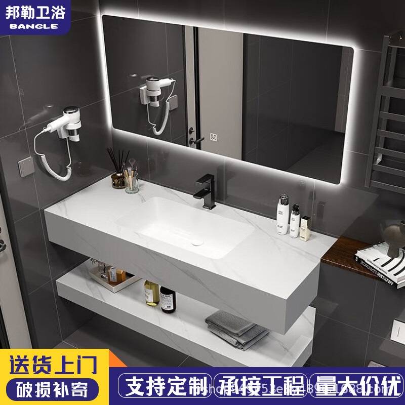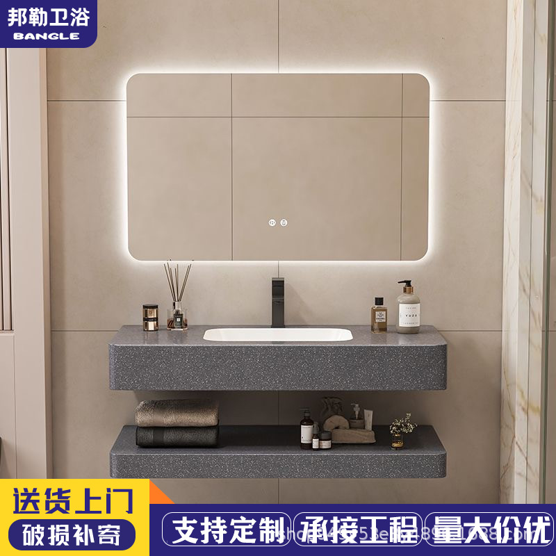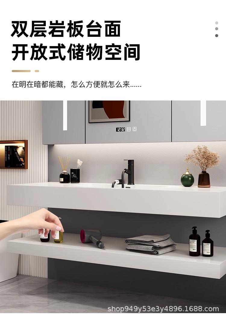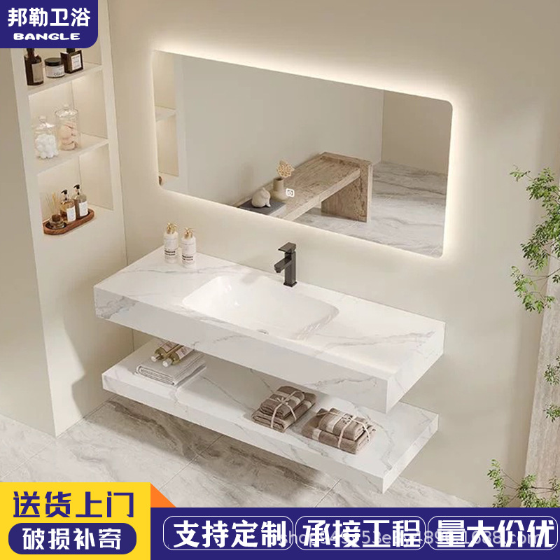 双层无缝岩板浴室柜定制宾馆酒店卫生间一体盆挂墙式浴室柜洗漱台