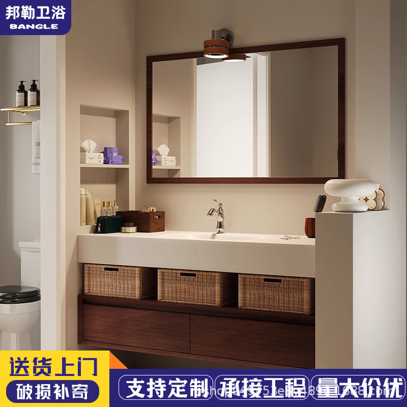 简约风浴室组合岩板热弯一体洗手脸台盆现代卫生间厕所实木洗漱盆