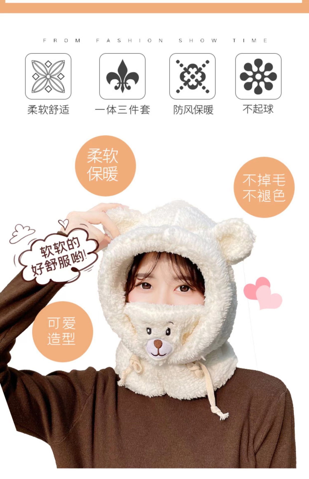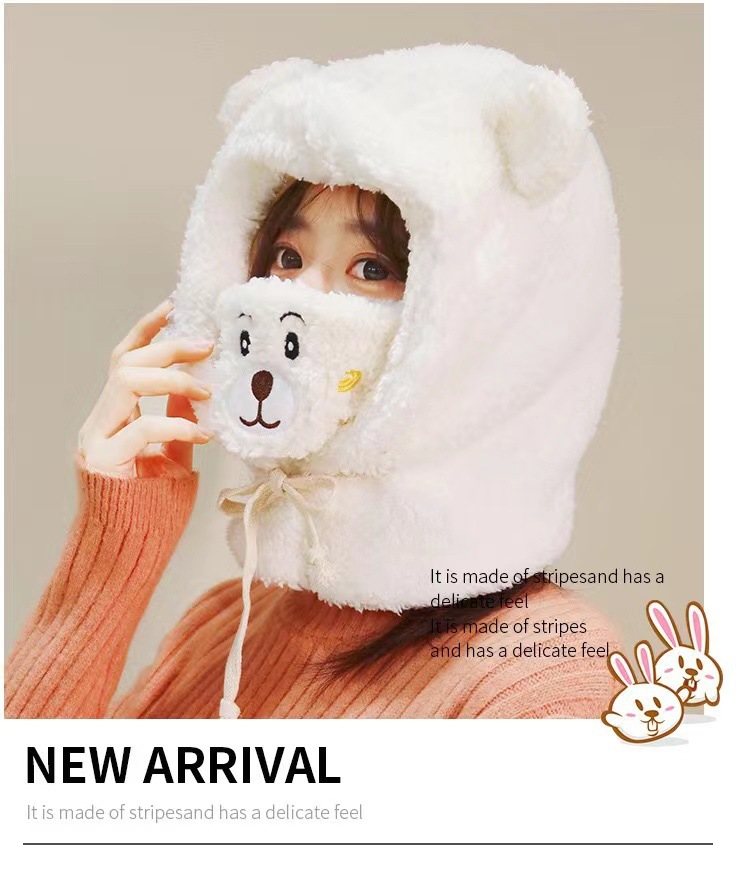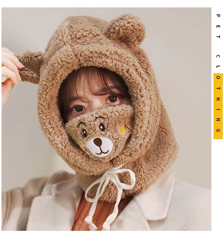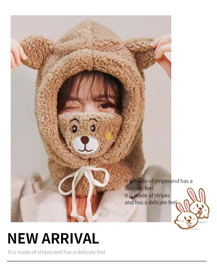 冬季口罩小熊毛绒帽子女卡通可爱保暖针织护耳帽保暖护脖连体帽子