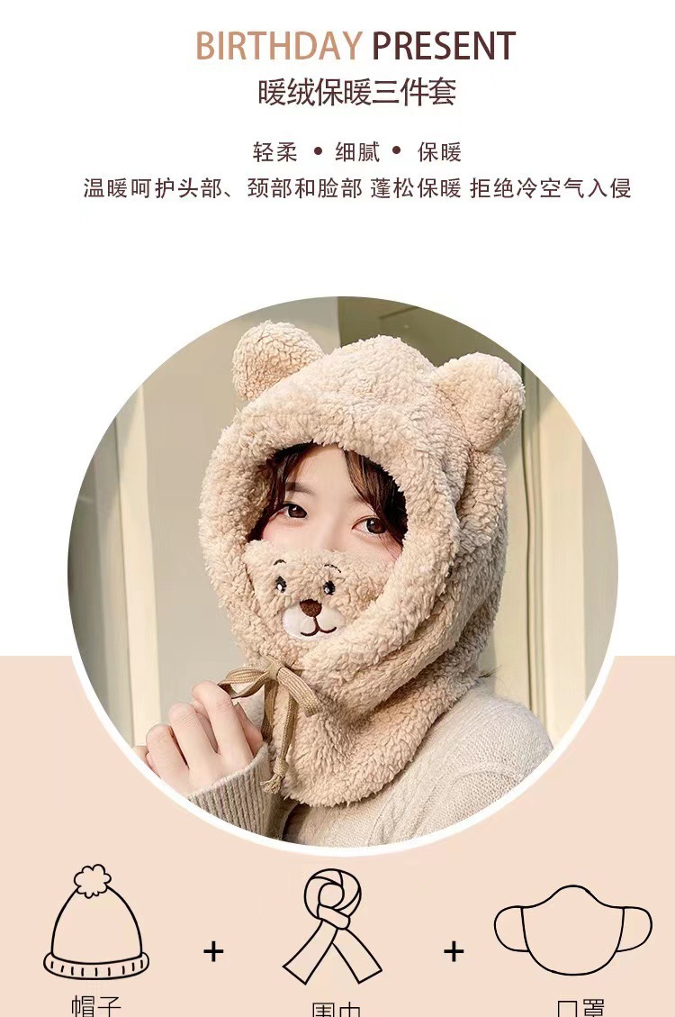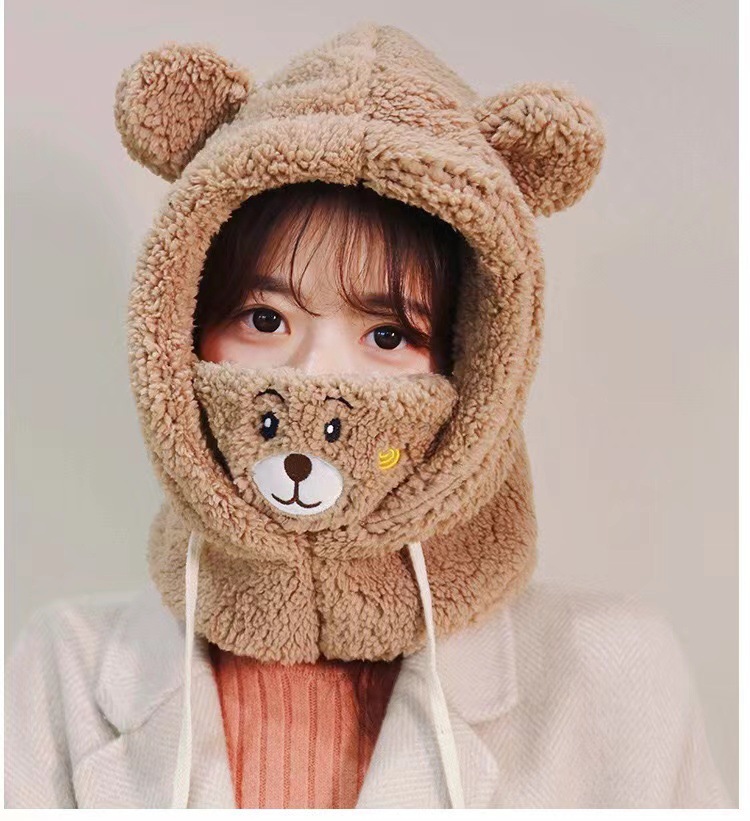 小熊毛绒帽口罩帽子围巾一体冬天女骑车防寒保暖帽子女秋冬套头帽