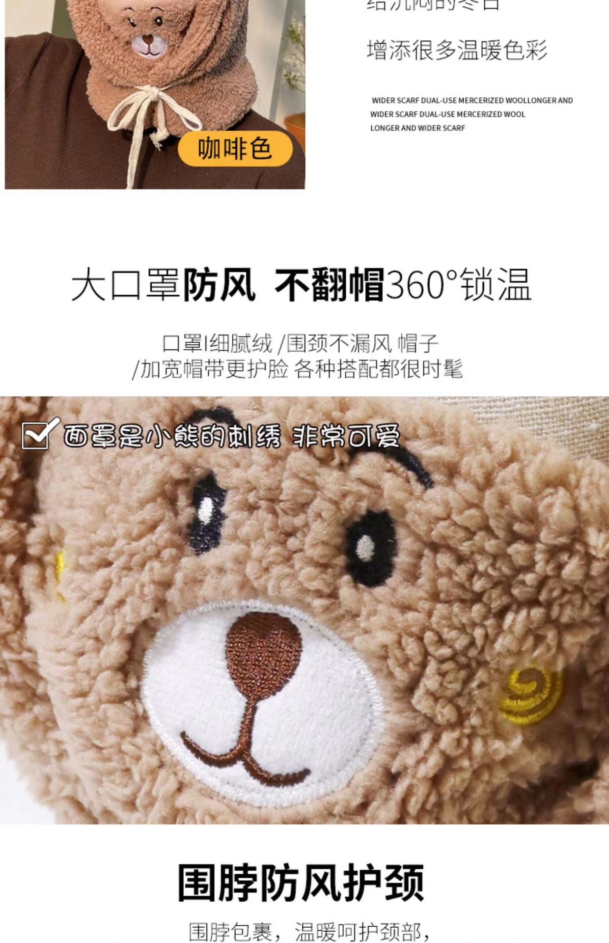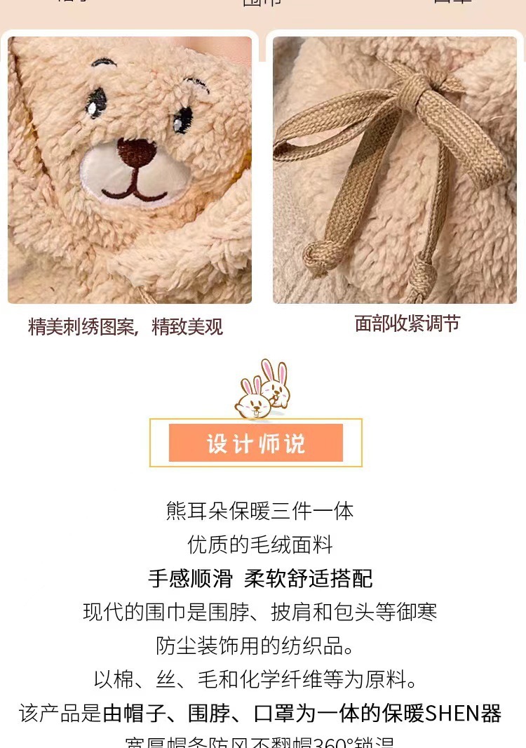 可爱小熊帽子围巾一体女冬季骑车保暖护耳毛绒加厚带口罩围脖连帽