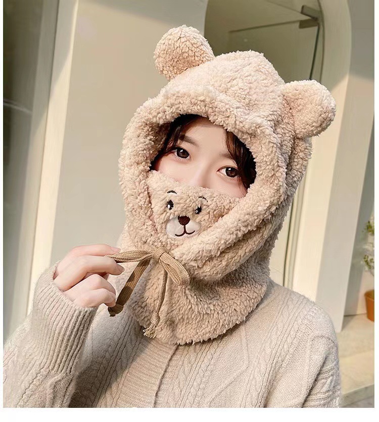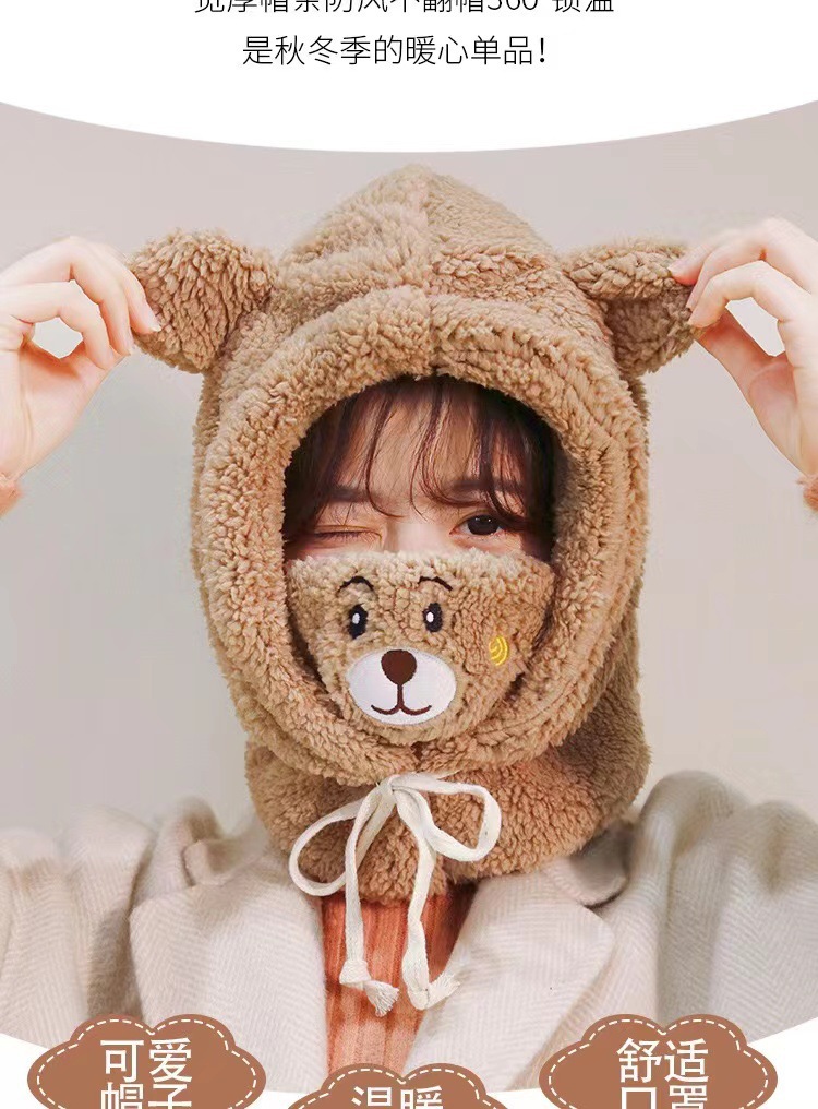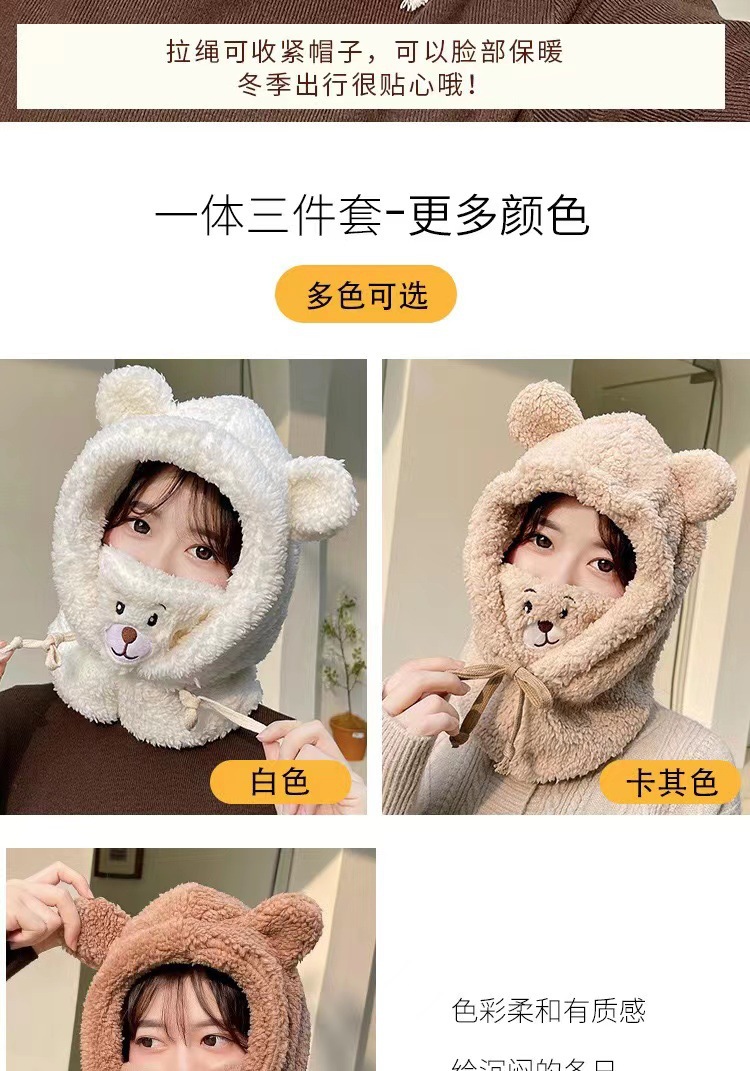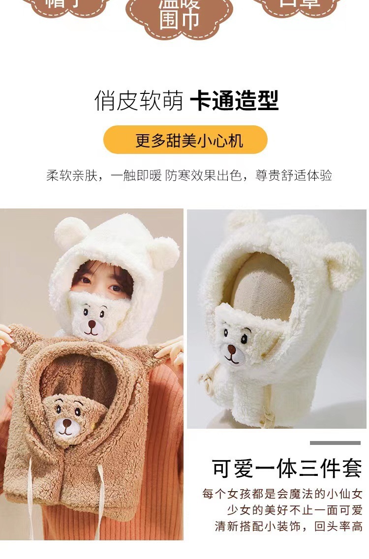 冬季可爱小熊围巾帽子保暖一体帽学生羊羔毛韩版女帽口罩毛绒帽子