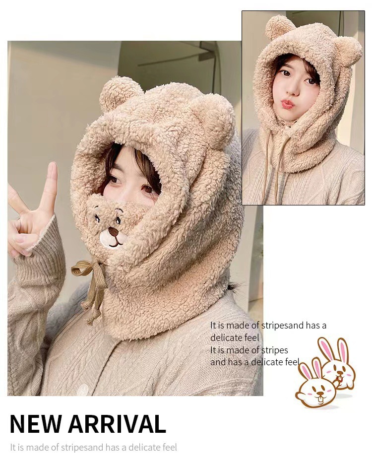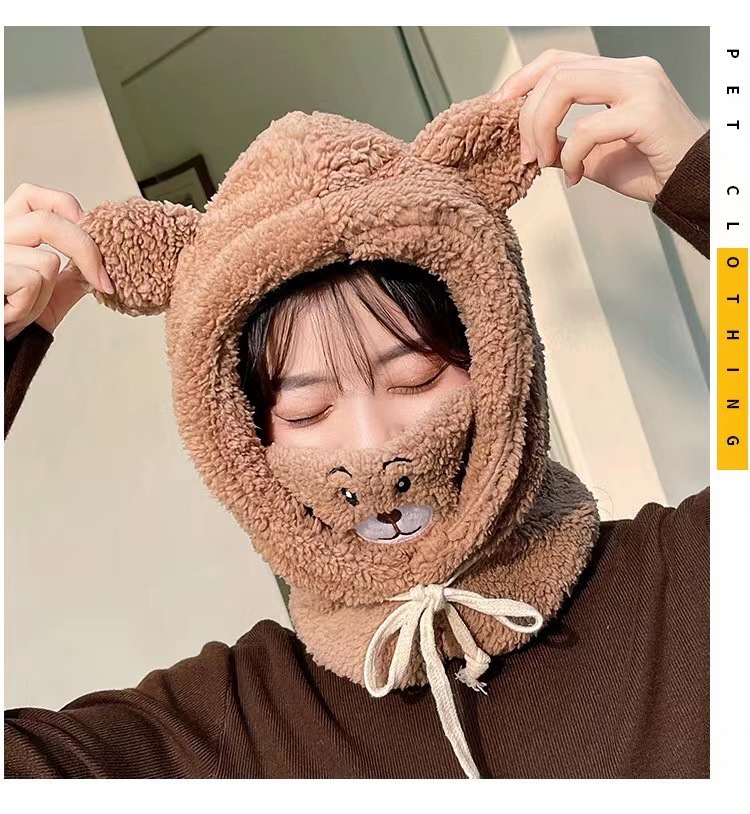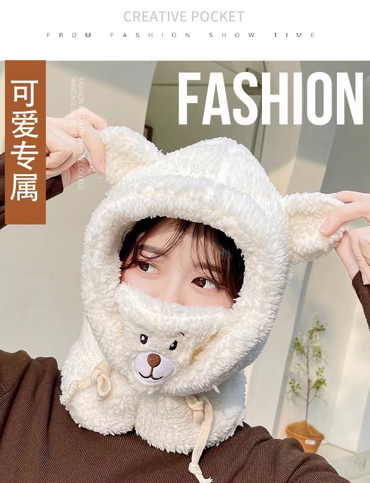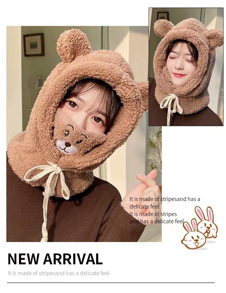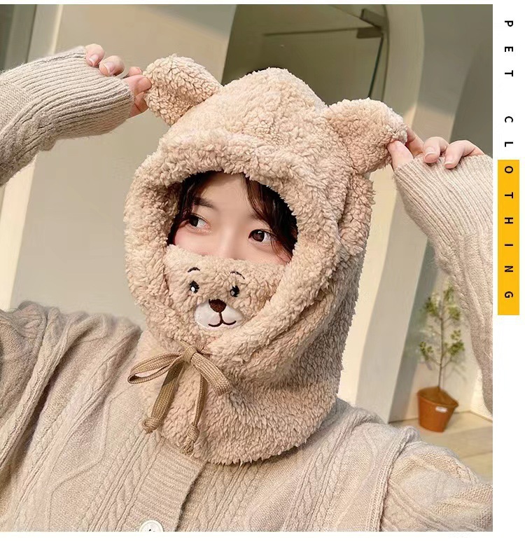 冬季可爱小熊围巾帽子保暖一体帽学生羊羔毛韩版女帽口罩毛绒帽子