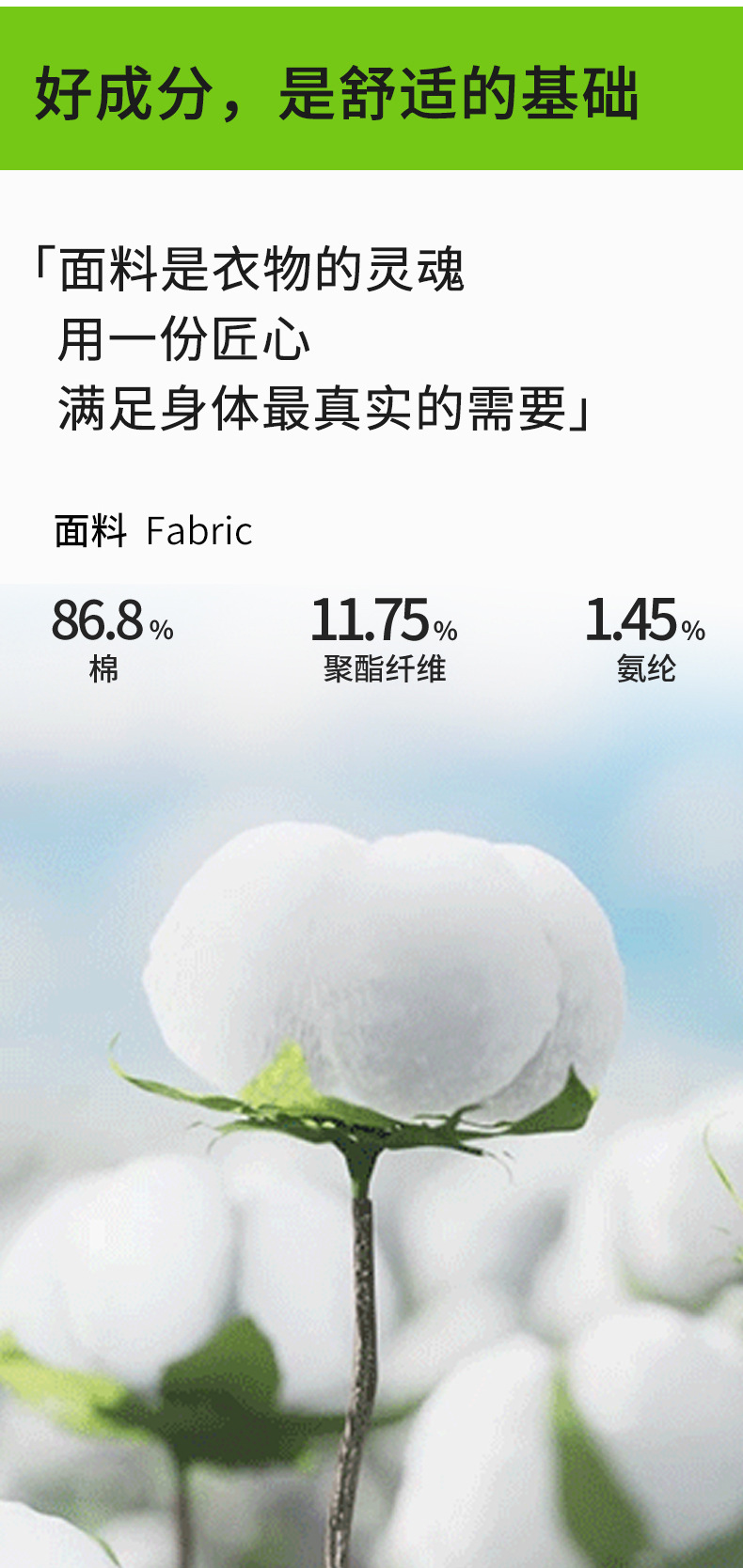 成分及含量 棉86.8%聚酯纤维11.75%氨纶1.45%