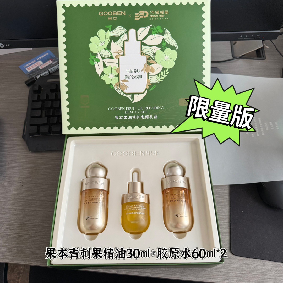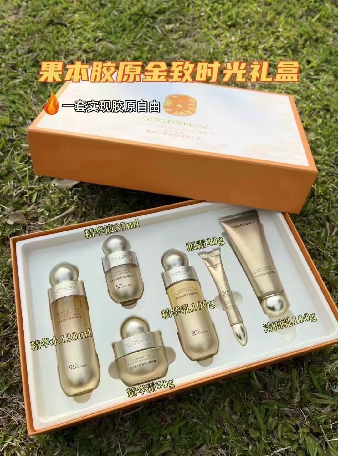 产品规格 果本胶原金致6件套(刮),金胶原精华水120ML(无盒),金胶原乳液100G(无盒),金胶原精华液35ML(无盒),金胶原精华霜50G(无盒),果油限量版套装,胶原水15ML*10支