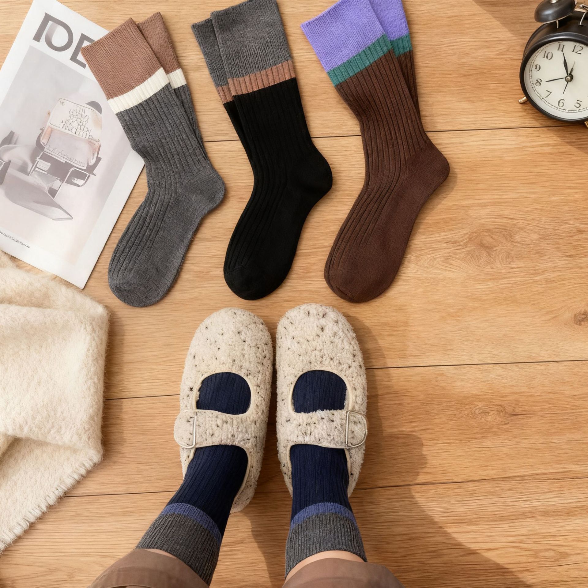 秋季新款 美拉德色系条纹时尚白搭老钱风中筒袜撞色简约袜子女袜