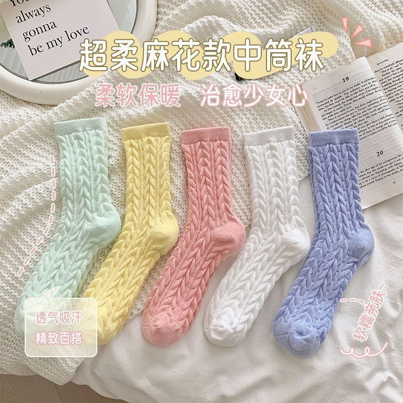 秋冬の女性用テリーソックス、厚手のミッドカーフソックス、柔らかくワックスのようなツイストソックス、冬用の暖かく耐寒性のロングソックス
