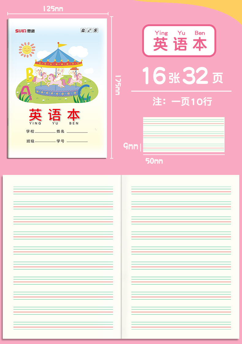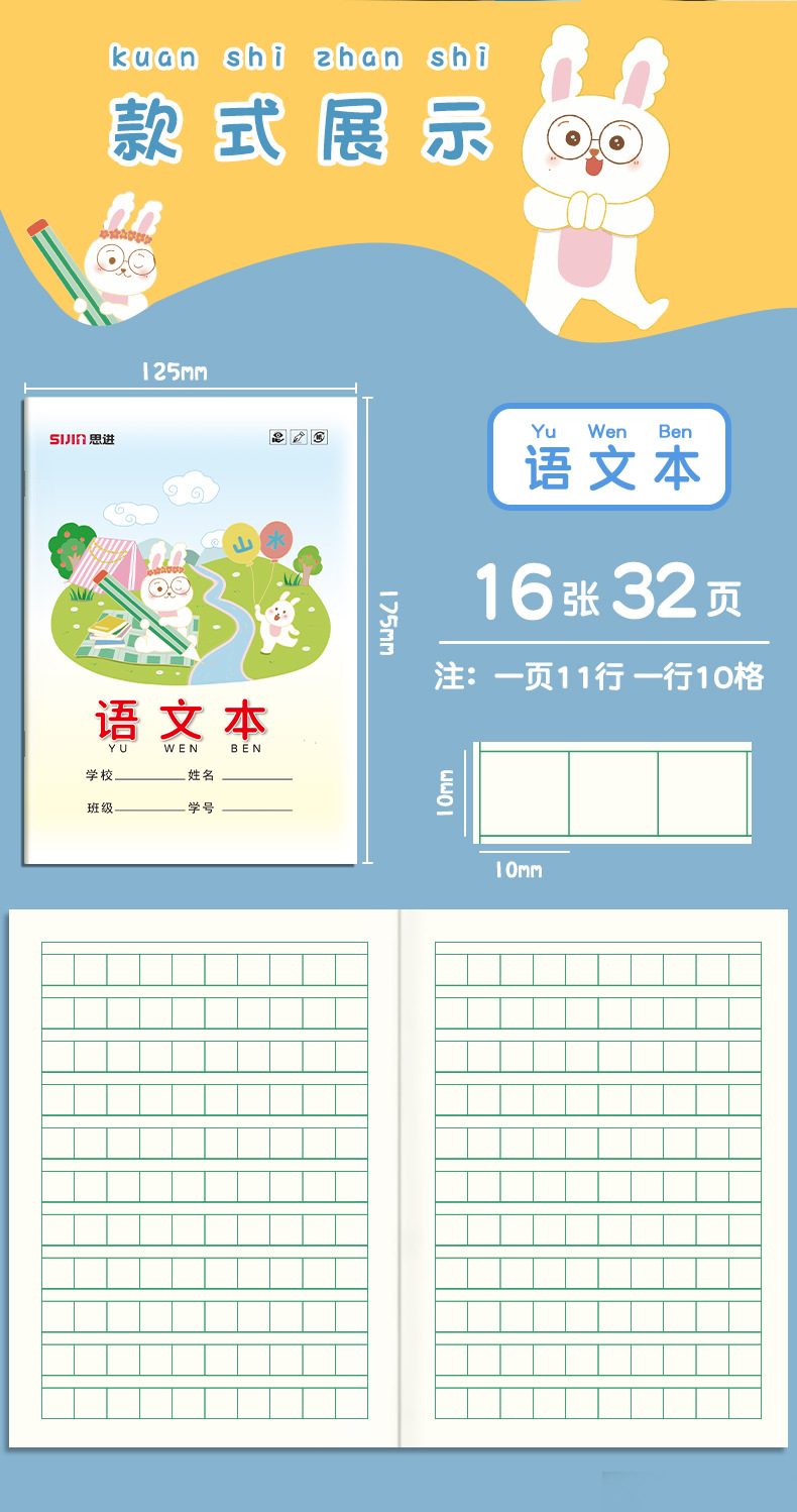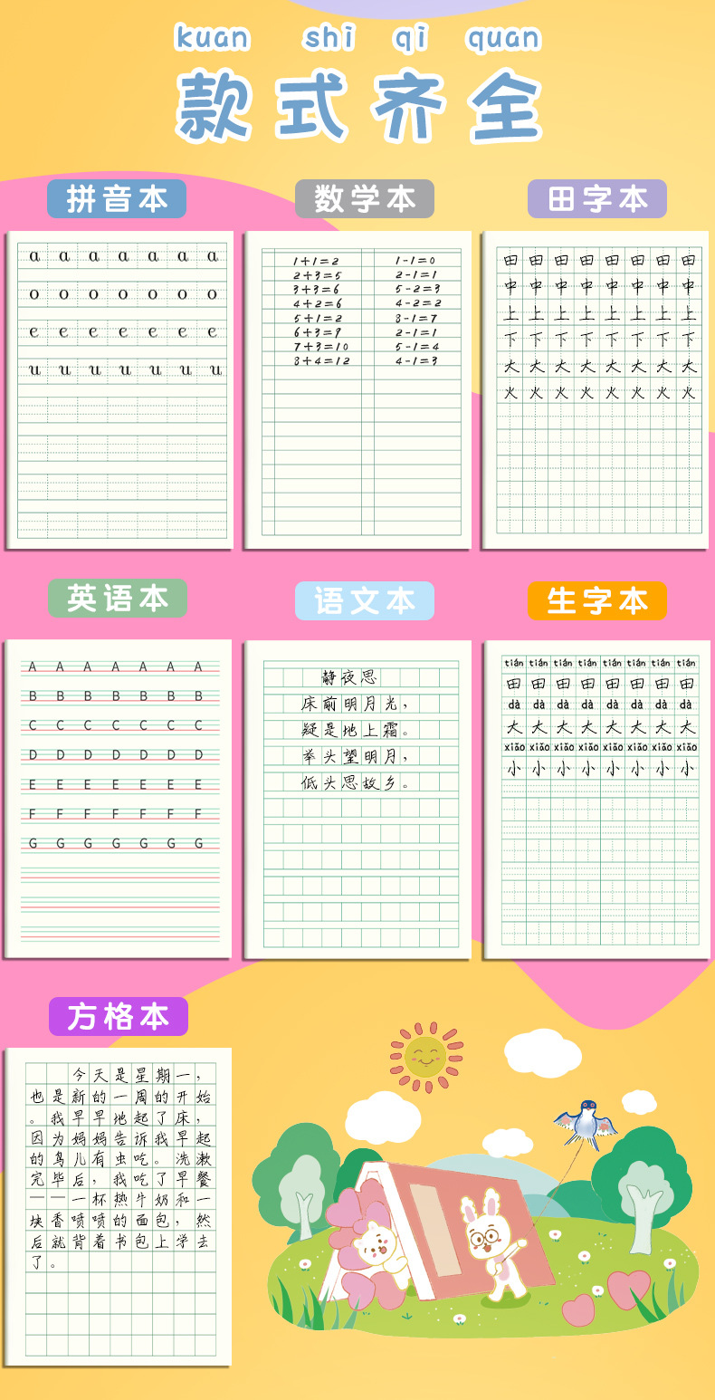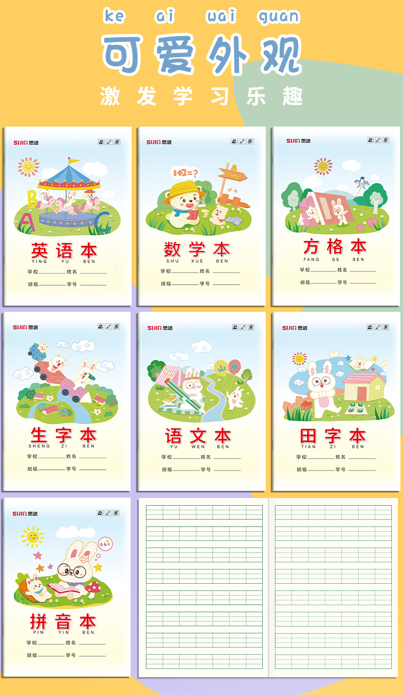 封面颜色 语文1本,数学1本,英语1本,拼音1本,田字1本,生字1本,方格1本