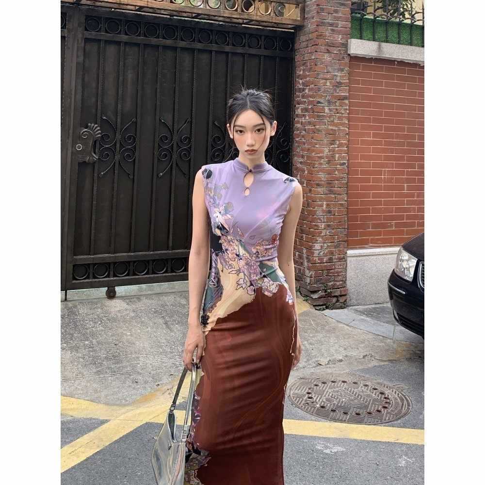 新中式国风前后两穿撞色旗袍连衣裙女夏鱼尾背心裙收腰包臀长裙子