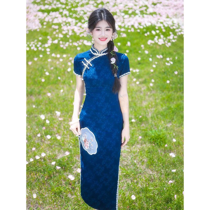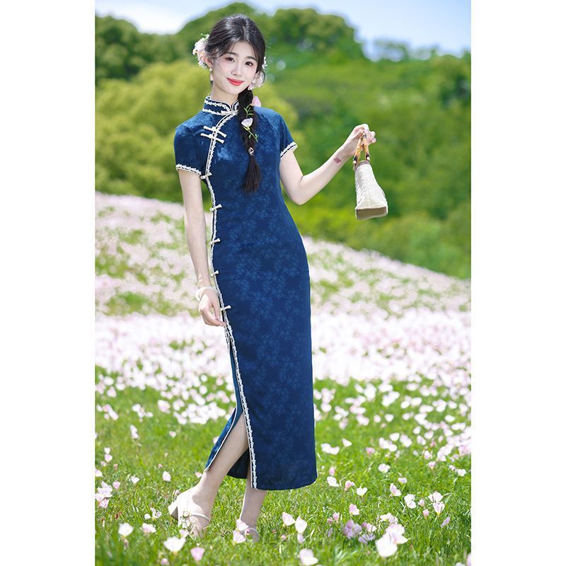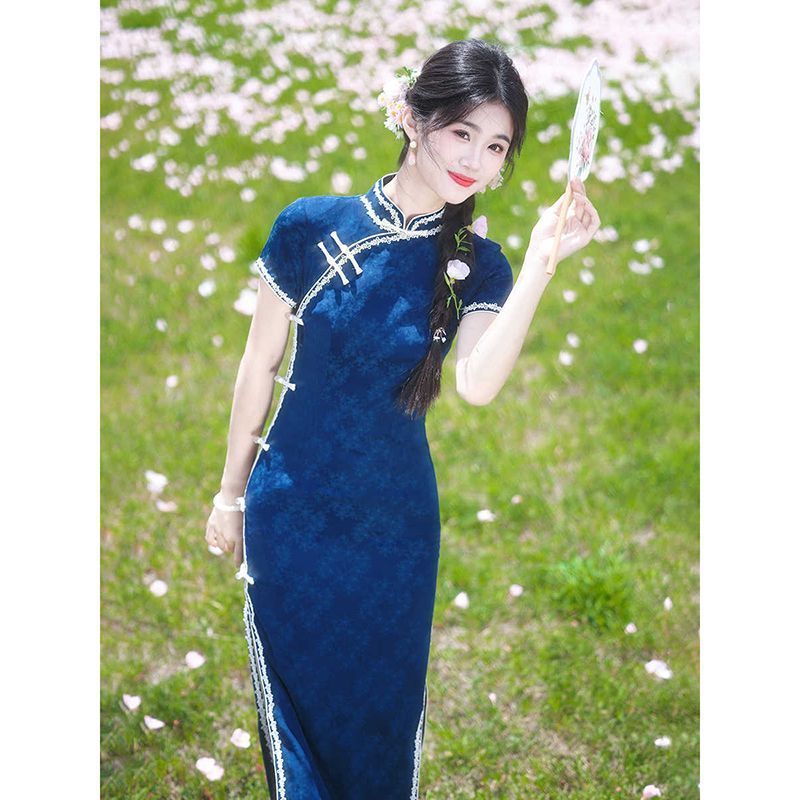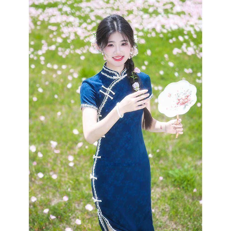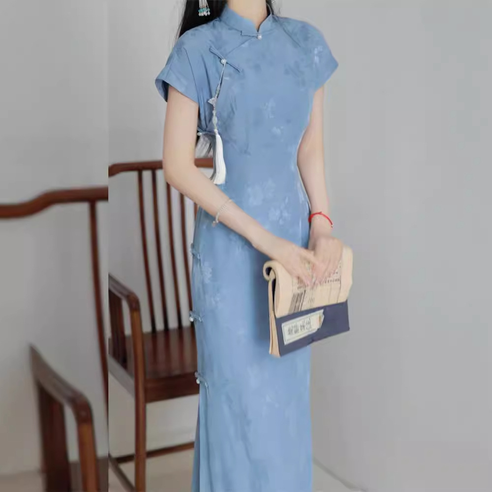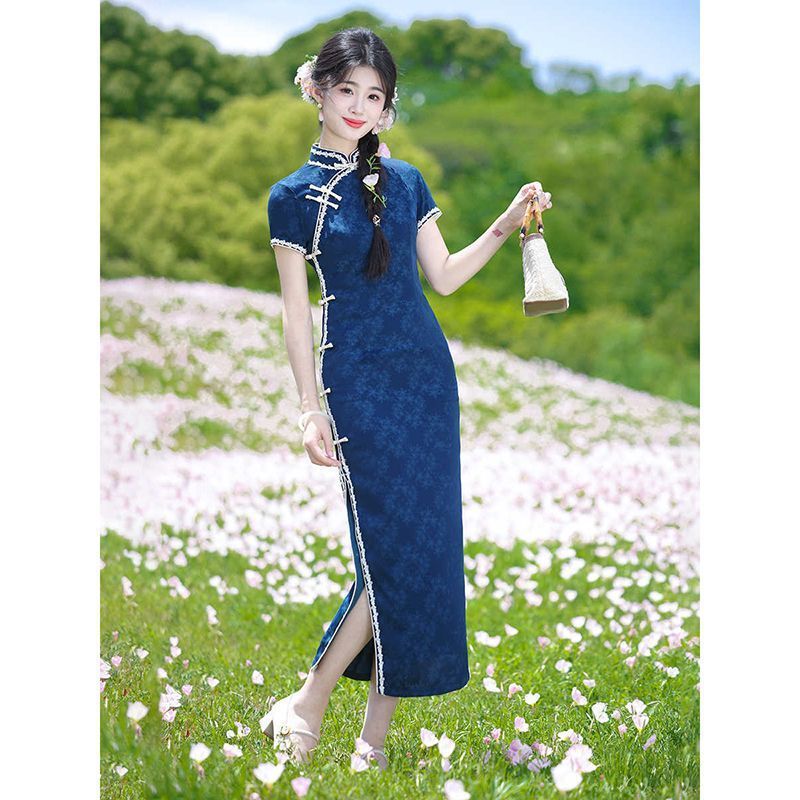 レトロな中華民国風の青いジャカード織り半袖チャイナドレス、2025年春夏新作、日常着としても着用可能、若い方向け