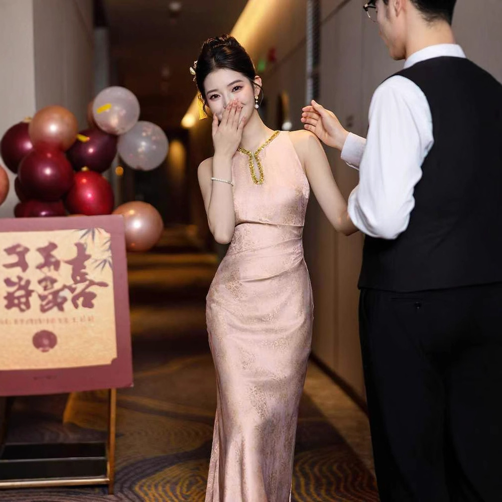 新中国式の高級大気の上の等級の若いタイプの朝の服のチャイナドレスの婚約するドレスのピンクは首の花嫁の敬酒服を掛けます。