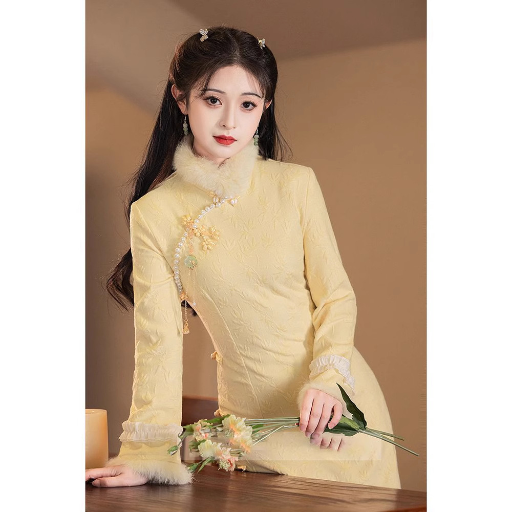 復古風改良チャイナドレス2024新高級修身秋冬金新中国式日常着冬に長袖を厚くする