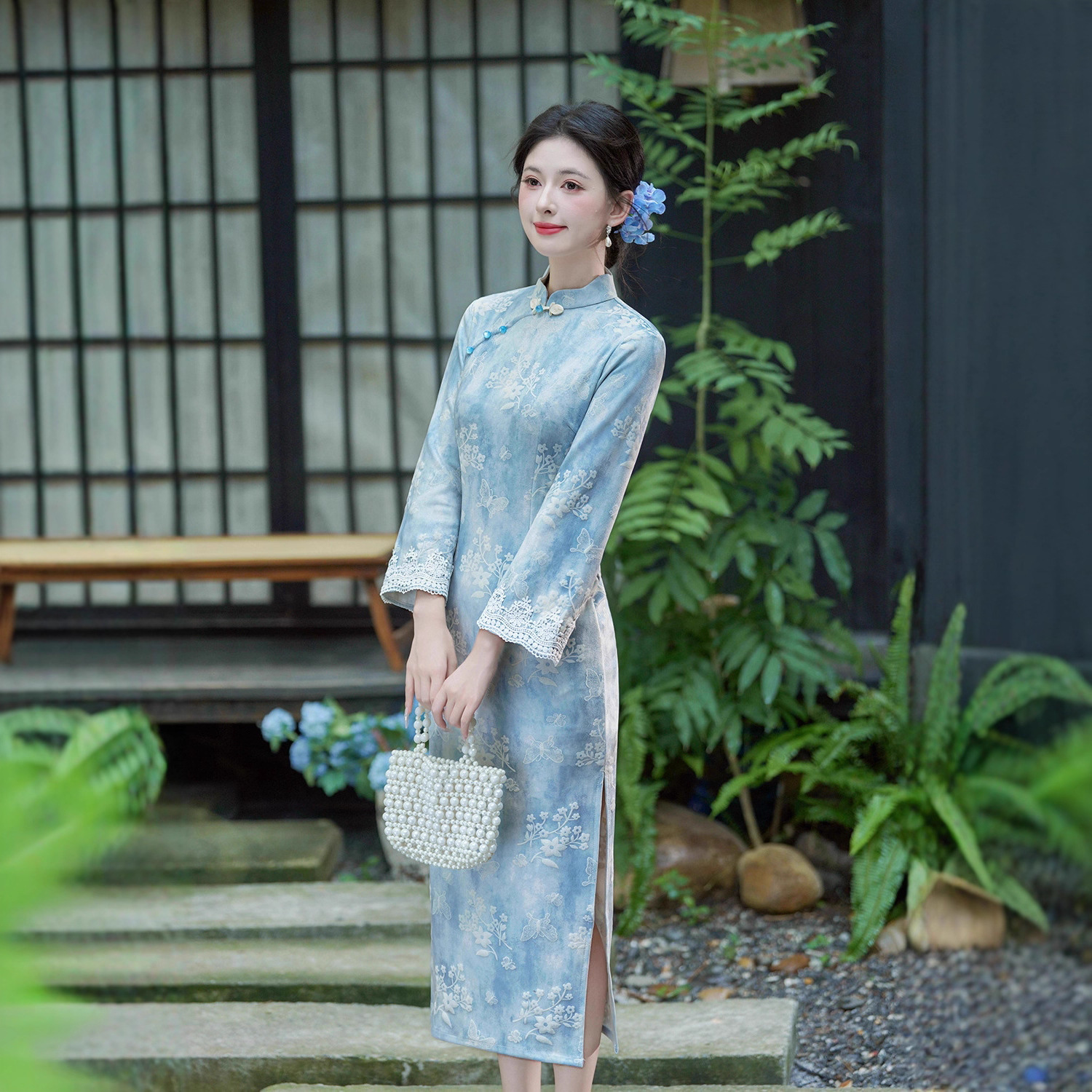 蓝色新中式改良长袖旗袍女2025秋季新款高级感复古显瘦日常连衣裙