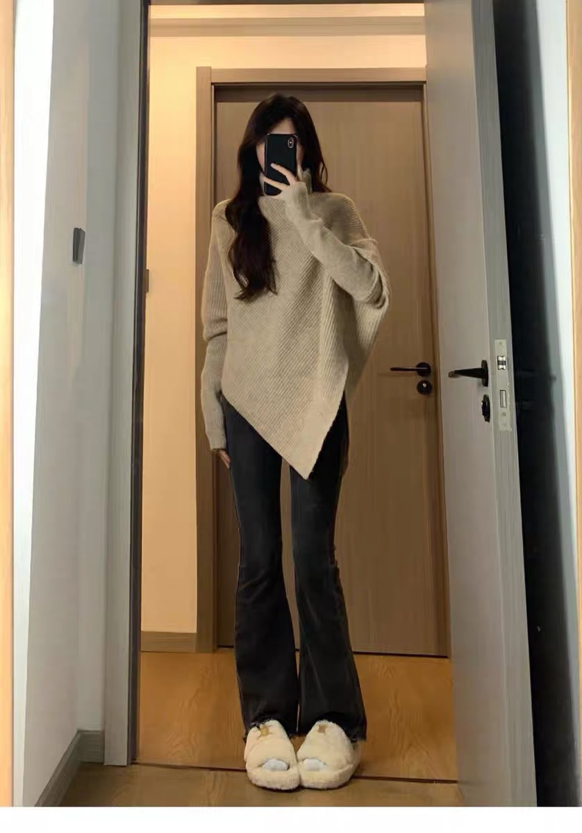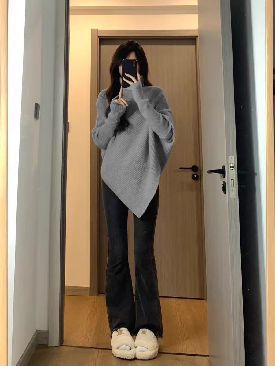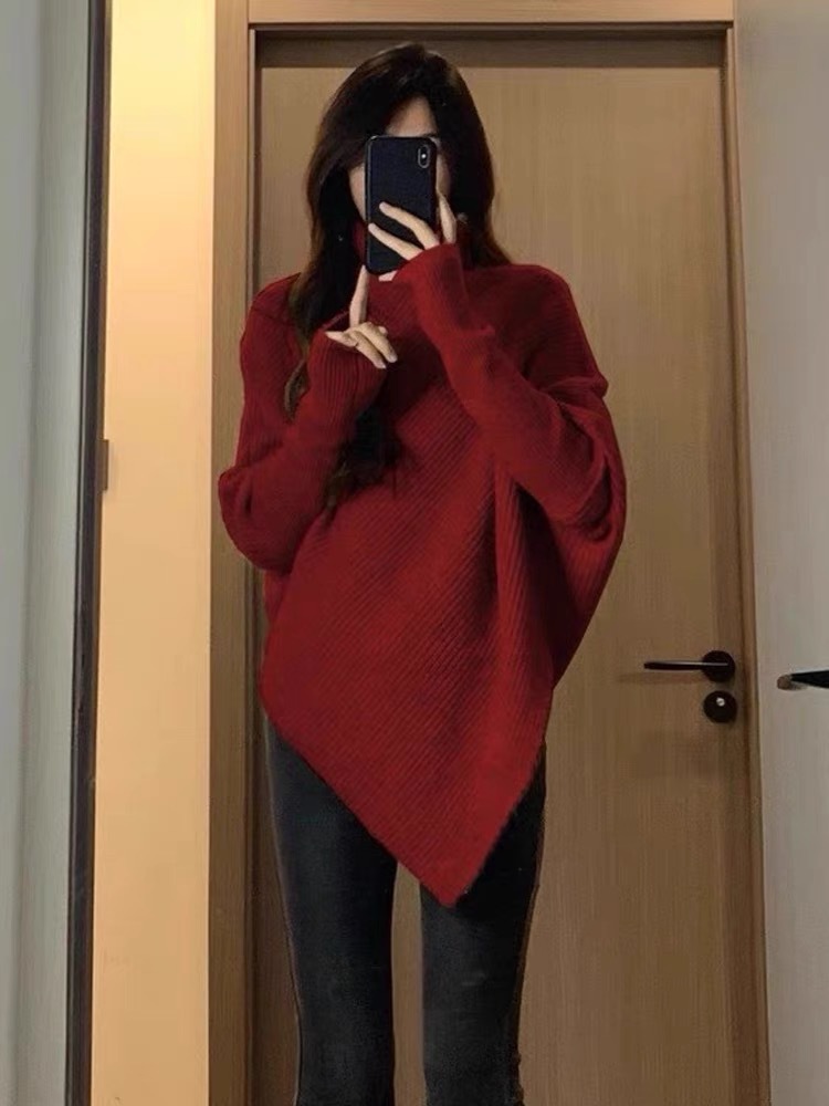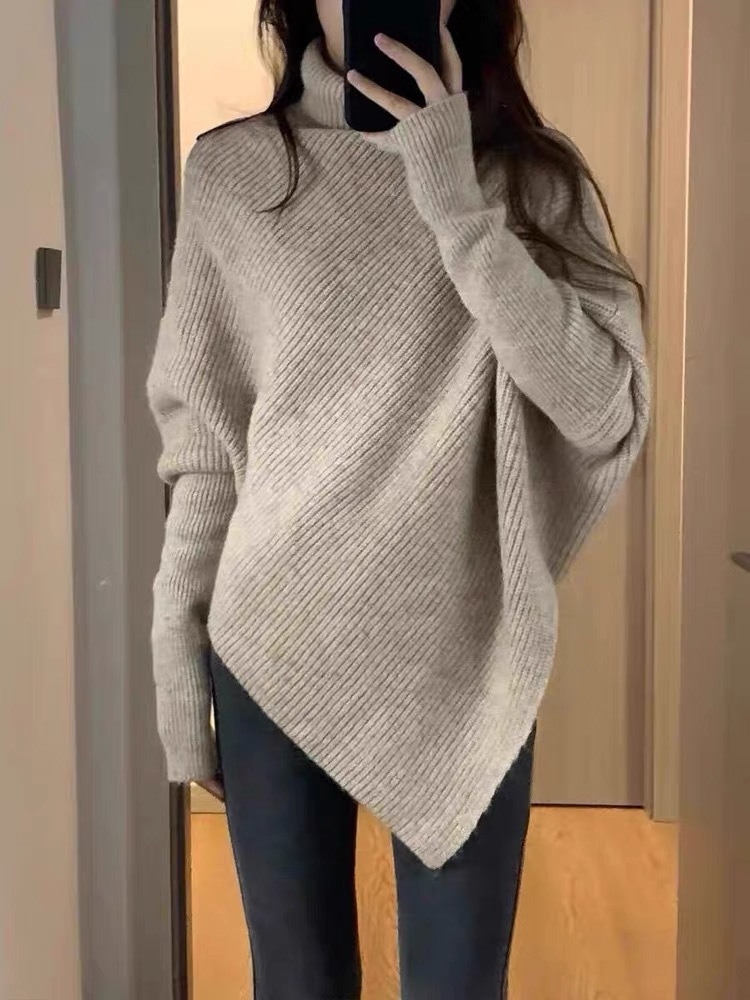 高领不规则小众100羊毛设计感毛衣女秋冬韩版宽松慵懒软糯上衣