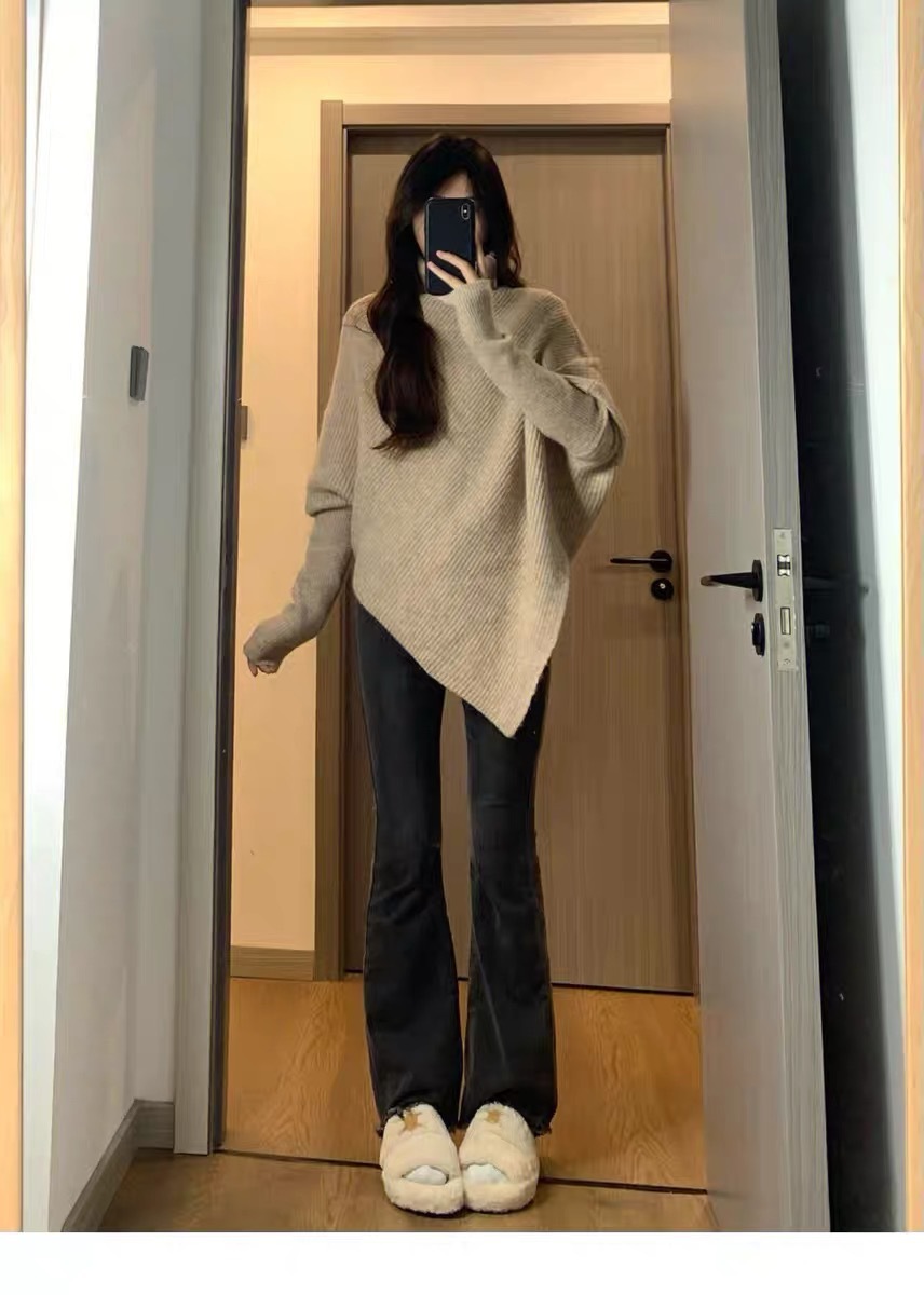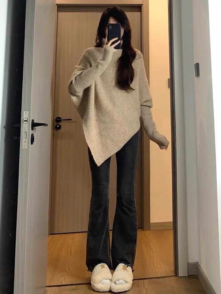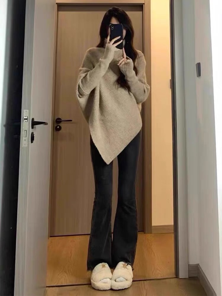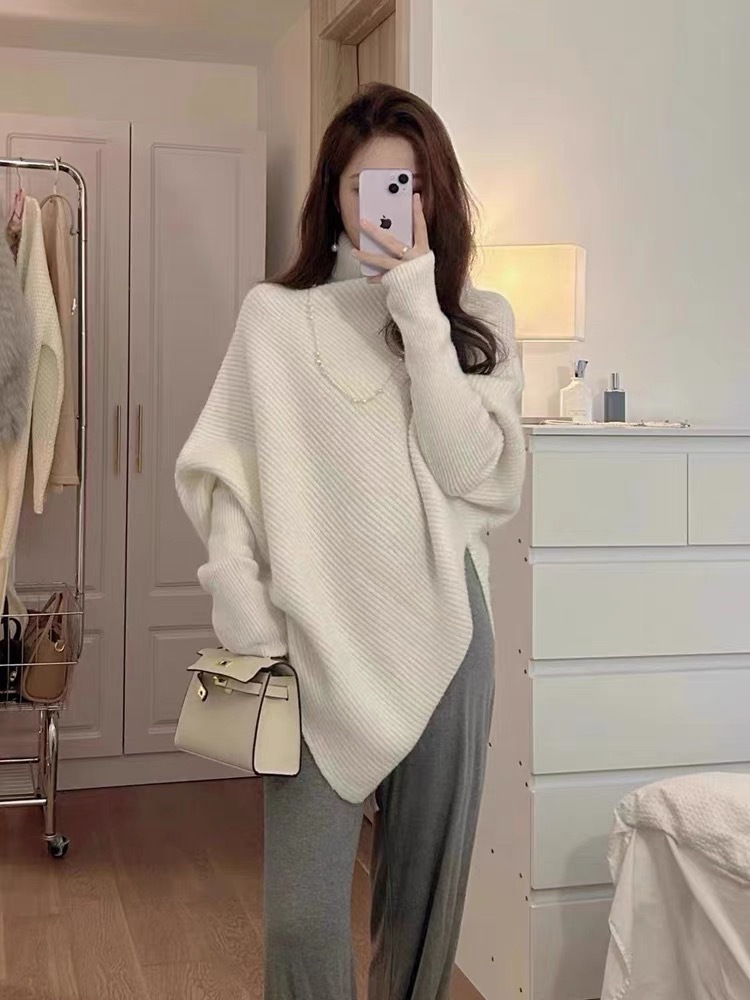 高领不规则小众100羊毛设计感毛衣女秋冬韩版宽松慵懒软糯上衣