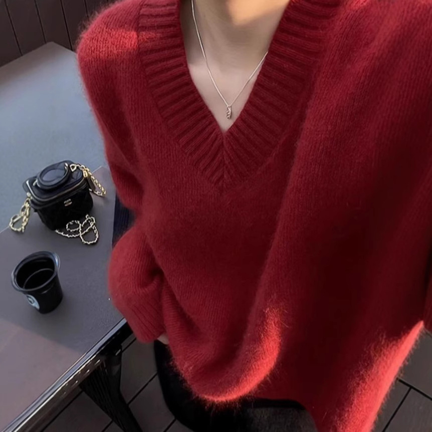 圣诞新年红色v领羊毛衫女慵懒风加厚毛衣遮肉宽松显瘦羊绒上衣