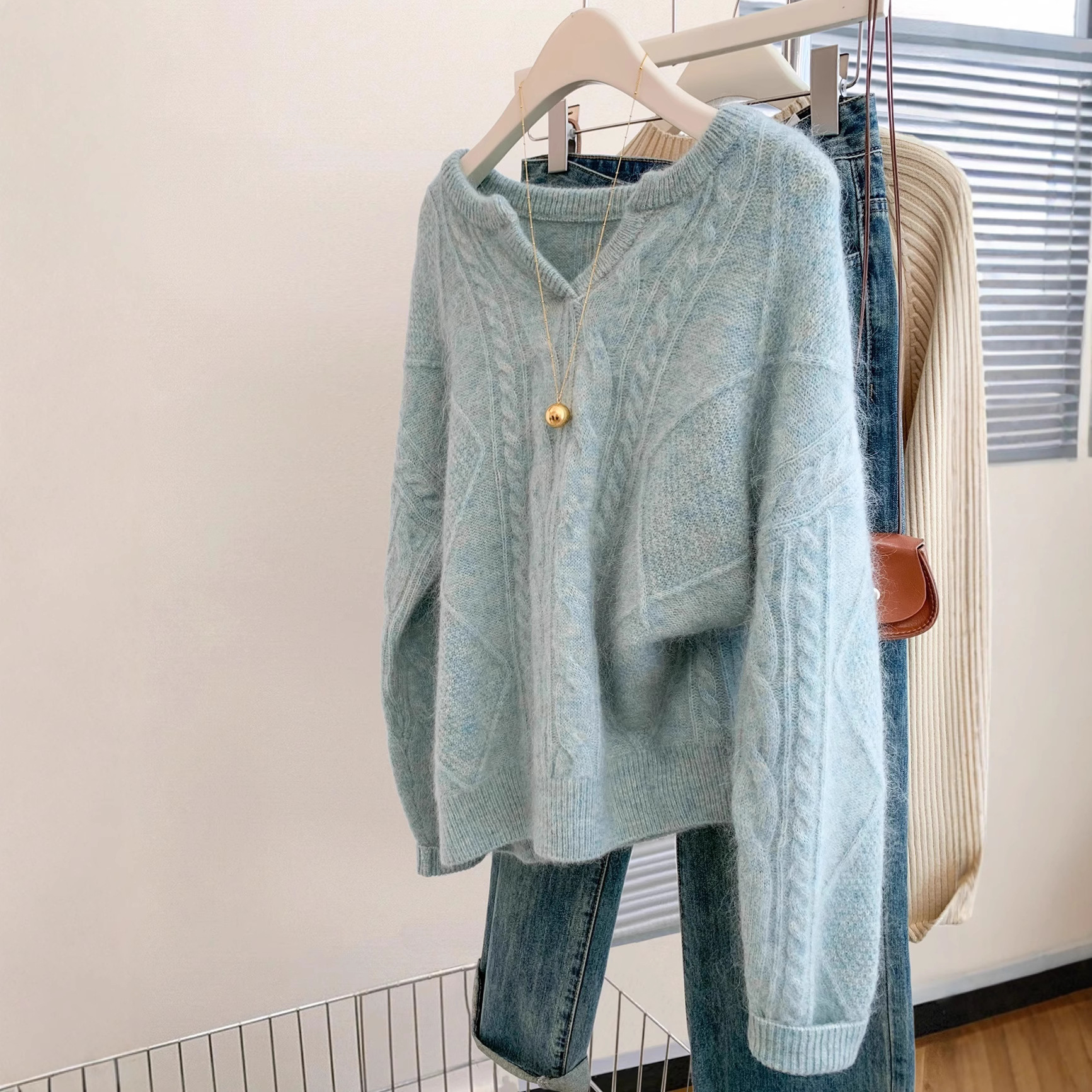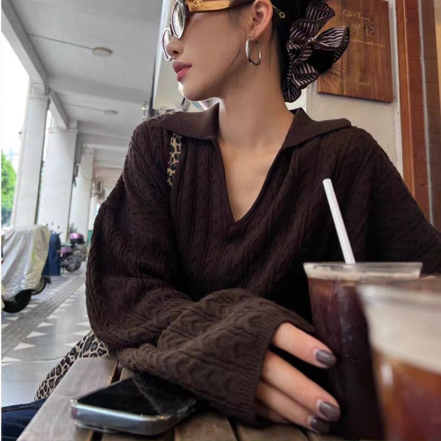 2025秋冬新款穿搭100羊毛女宽松慵懒风麻花软糯半开v领毛衣外穿