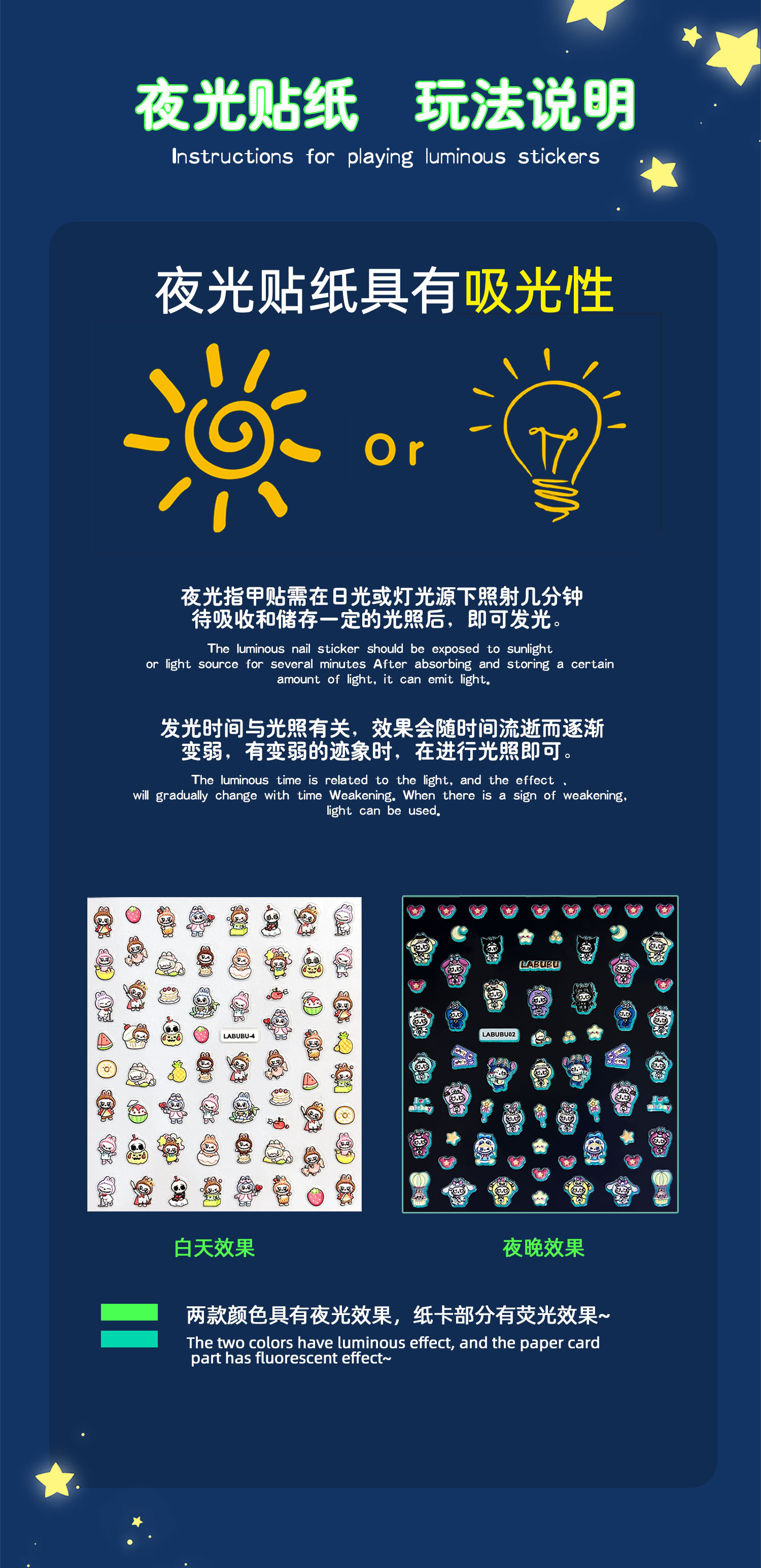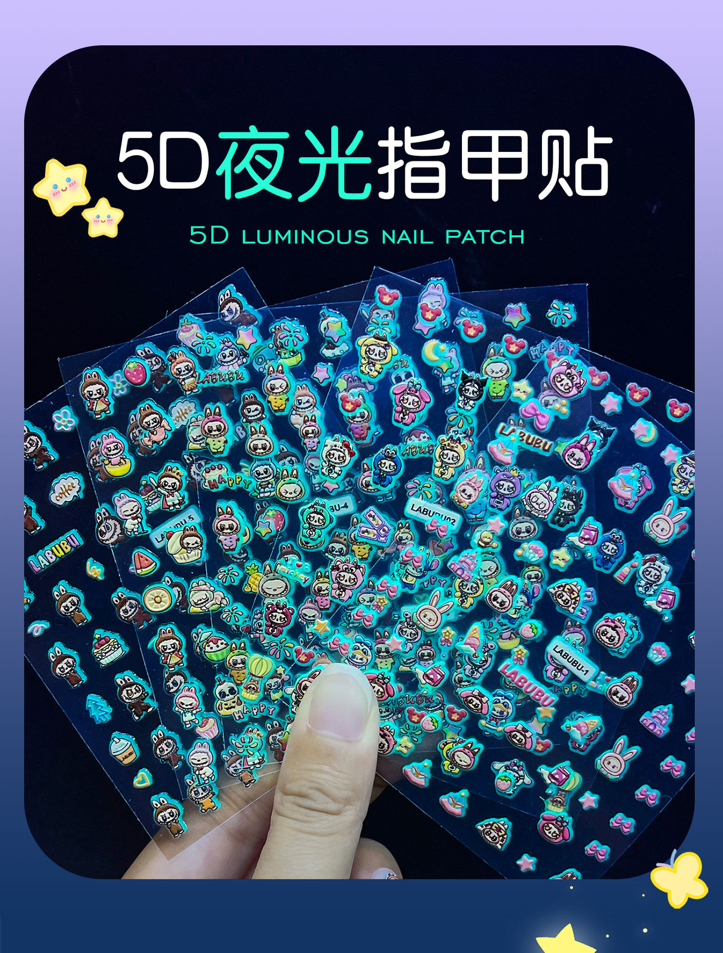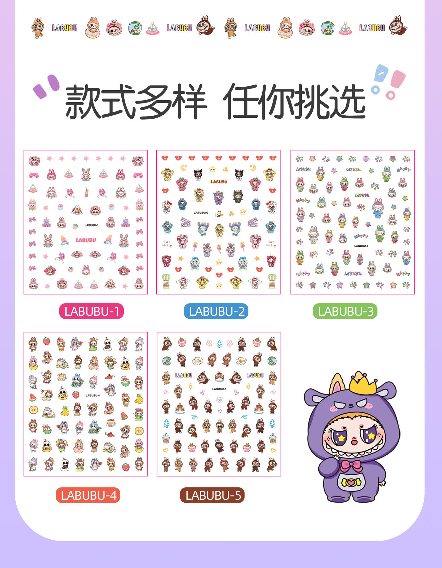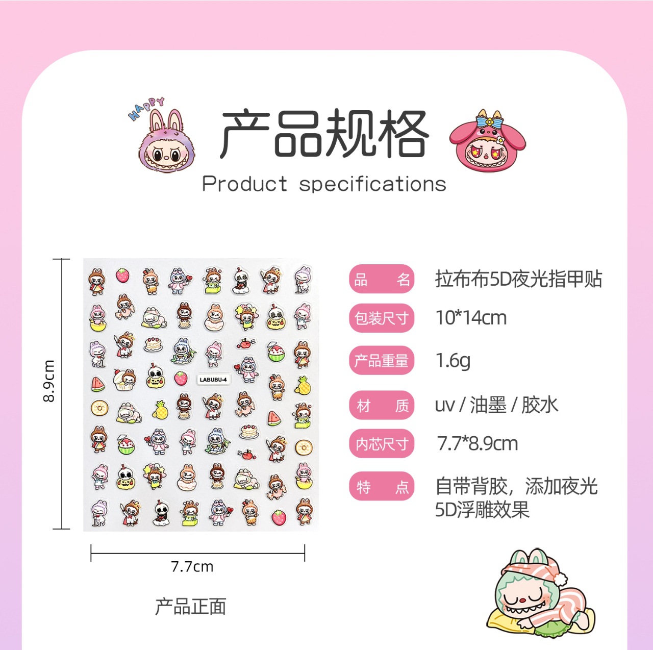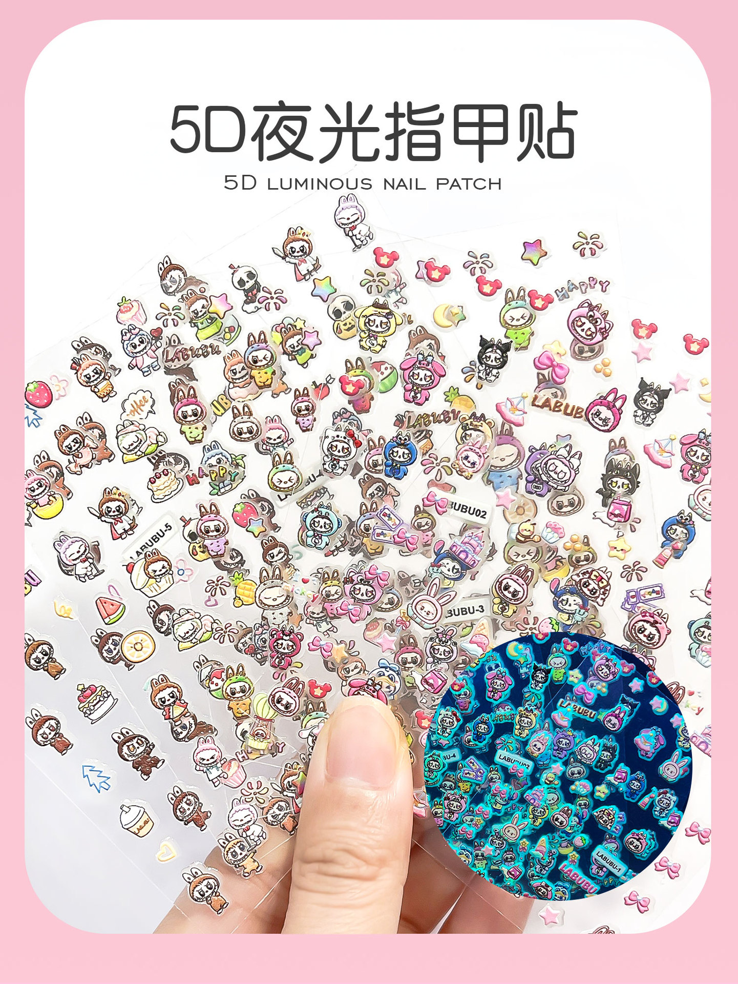 规格类型 粉色labubu-1(5D夜光),三丽鸥labubu-2(5D夜光指甲贴),渐变色labubu-3(5D夜光指甲贴),甜品labubu-4(5D夜光指甲贴),隐藏款labubu-5(5D夜光指甲贴)