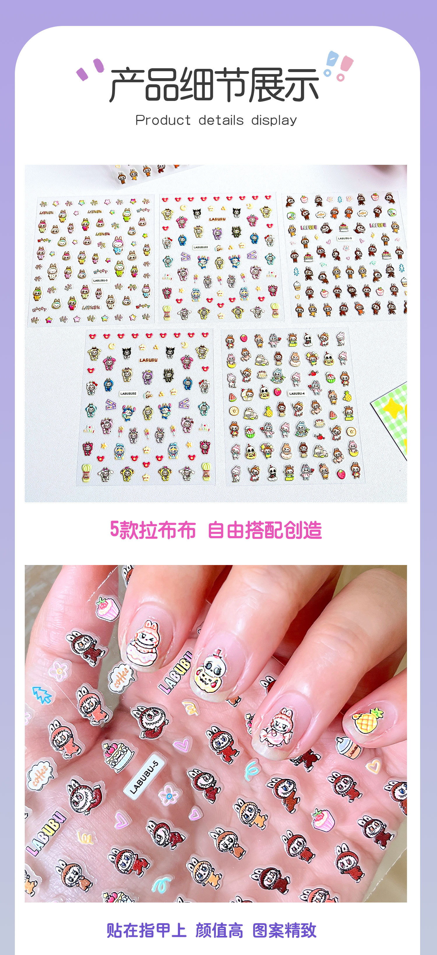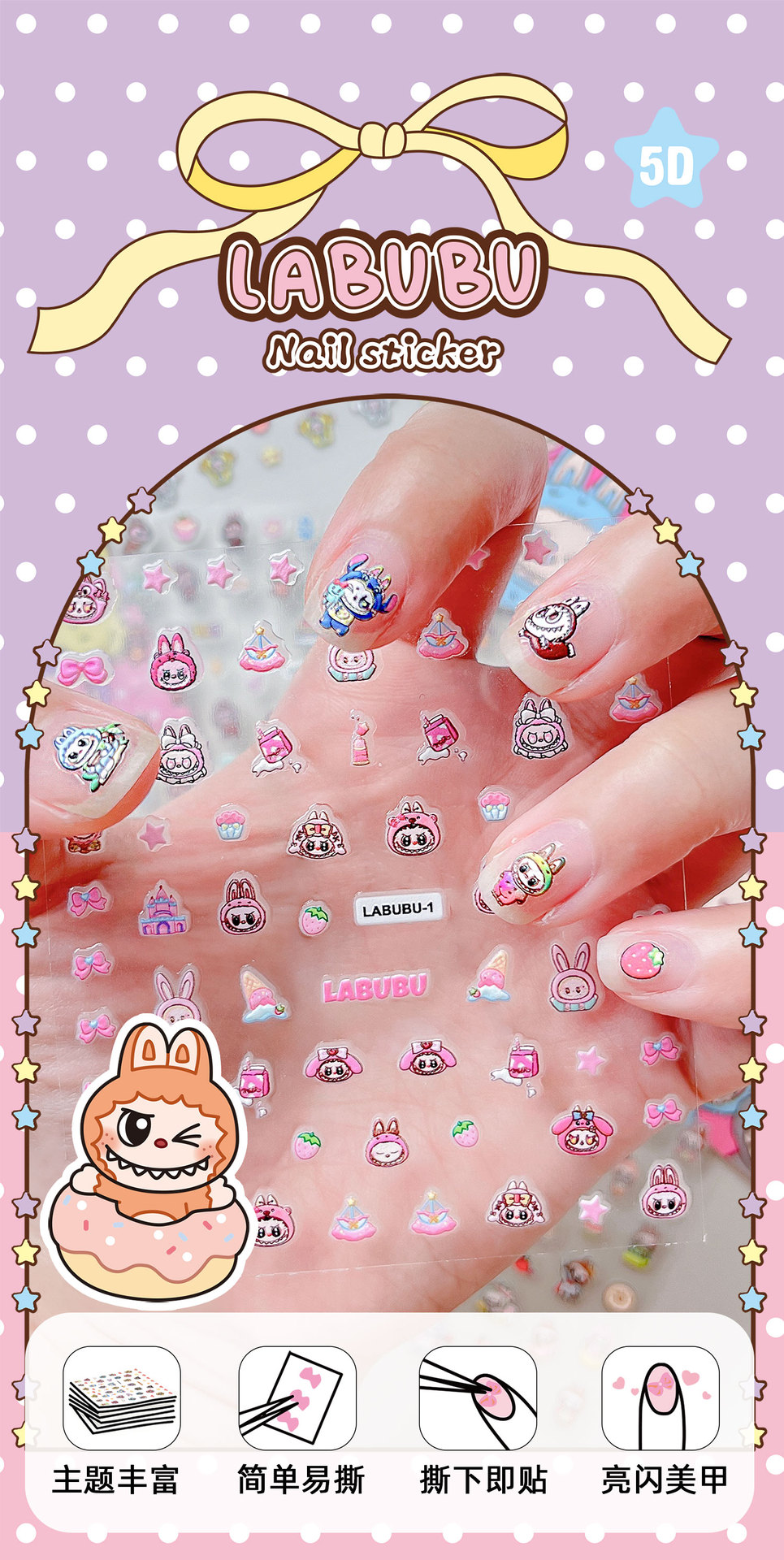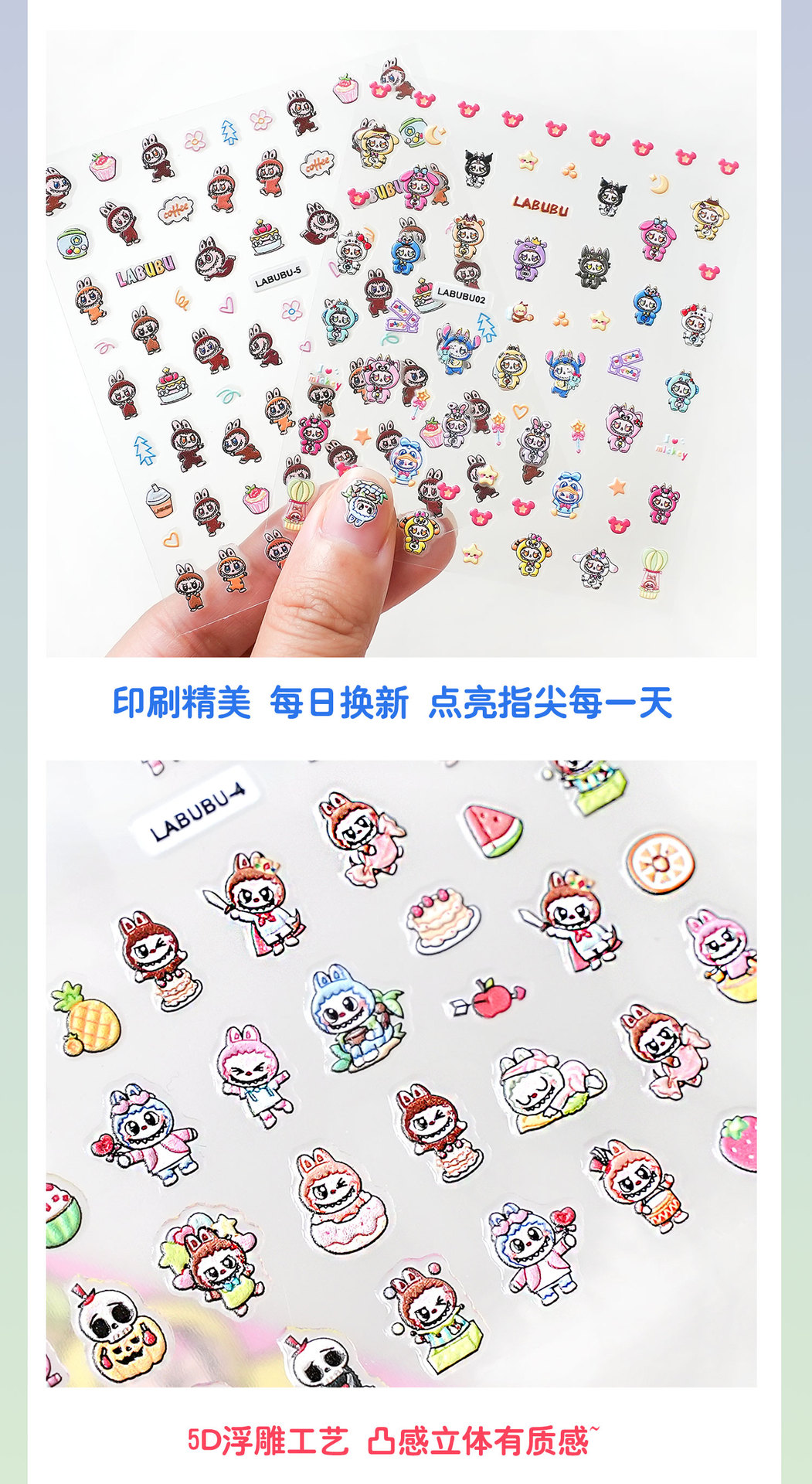 可爱拉布布浮雕立体美甲贴纸labubu指甲贴花小鼻嘎迷你卡通手账贴