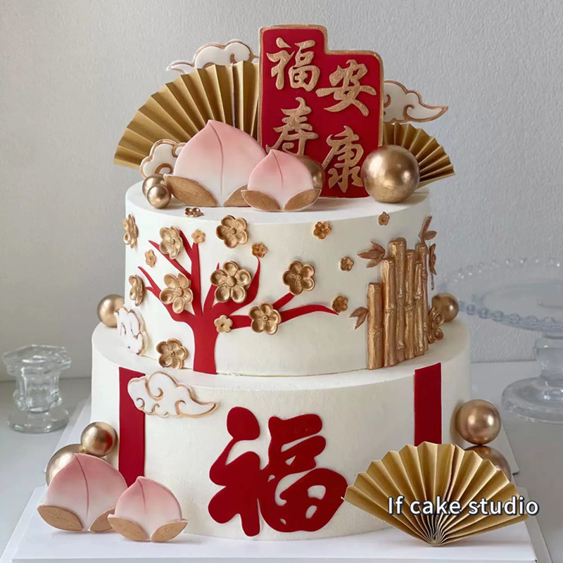 古代風の赤い誕生日ケーキの装飾、縁起の良い雲と鶴、誕生日の扇子、東海の祝福、長寿の祝福プラグイン