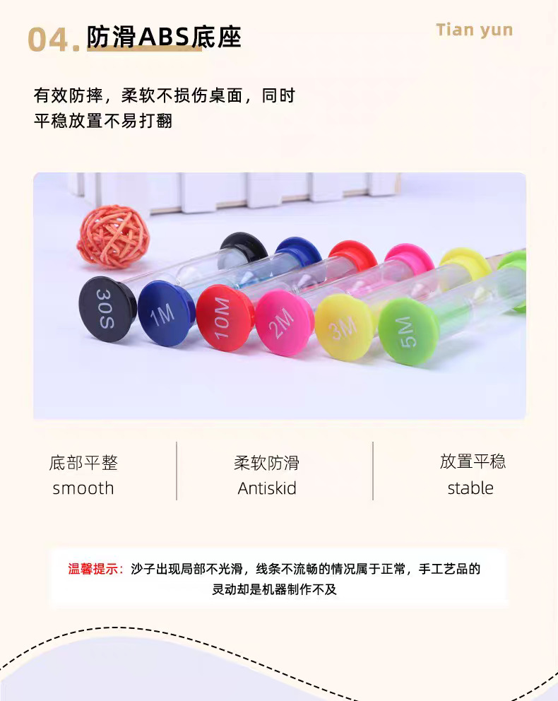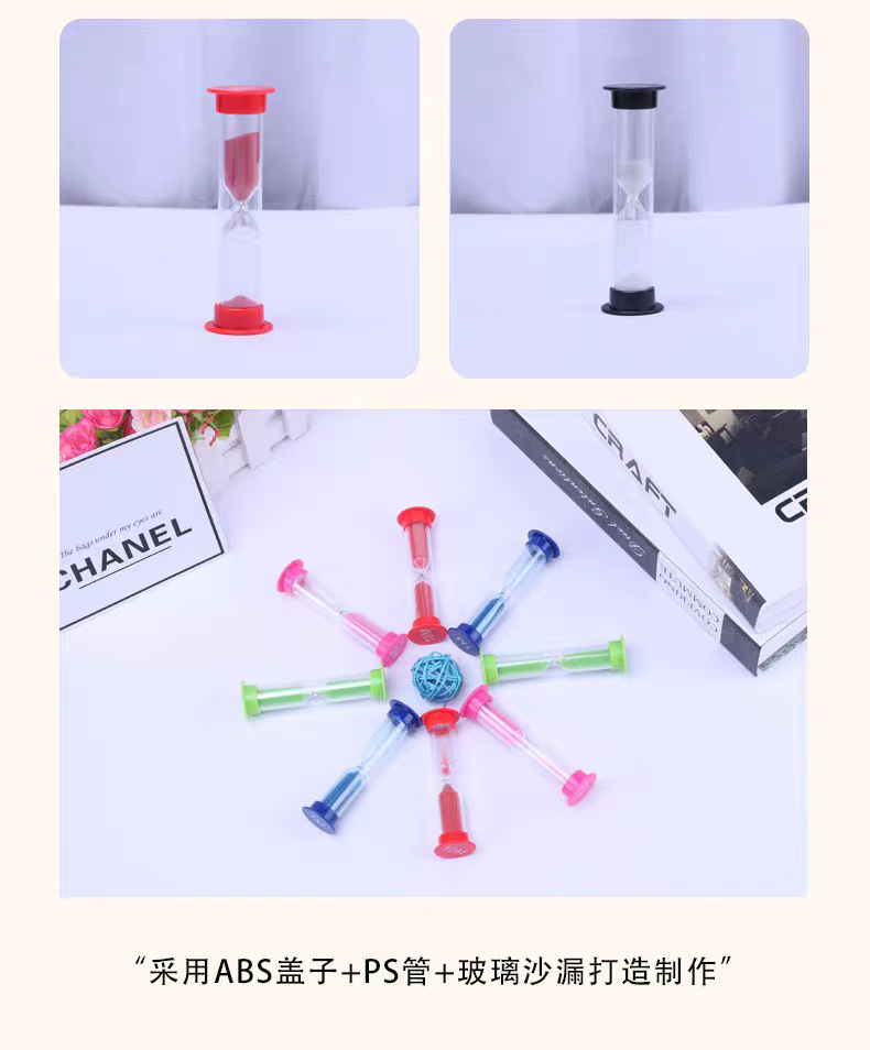 尺寸 小圆盖黑色沙漏30秒,小圆盖蓝色沙漏1分钟,小圆盖粉色沙漏2分钟,小圆盖黄色沙漏3分钟,小圆盖绿色沙漏5分钟,小圆盖红色沙漏10分钟